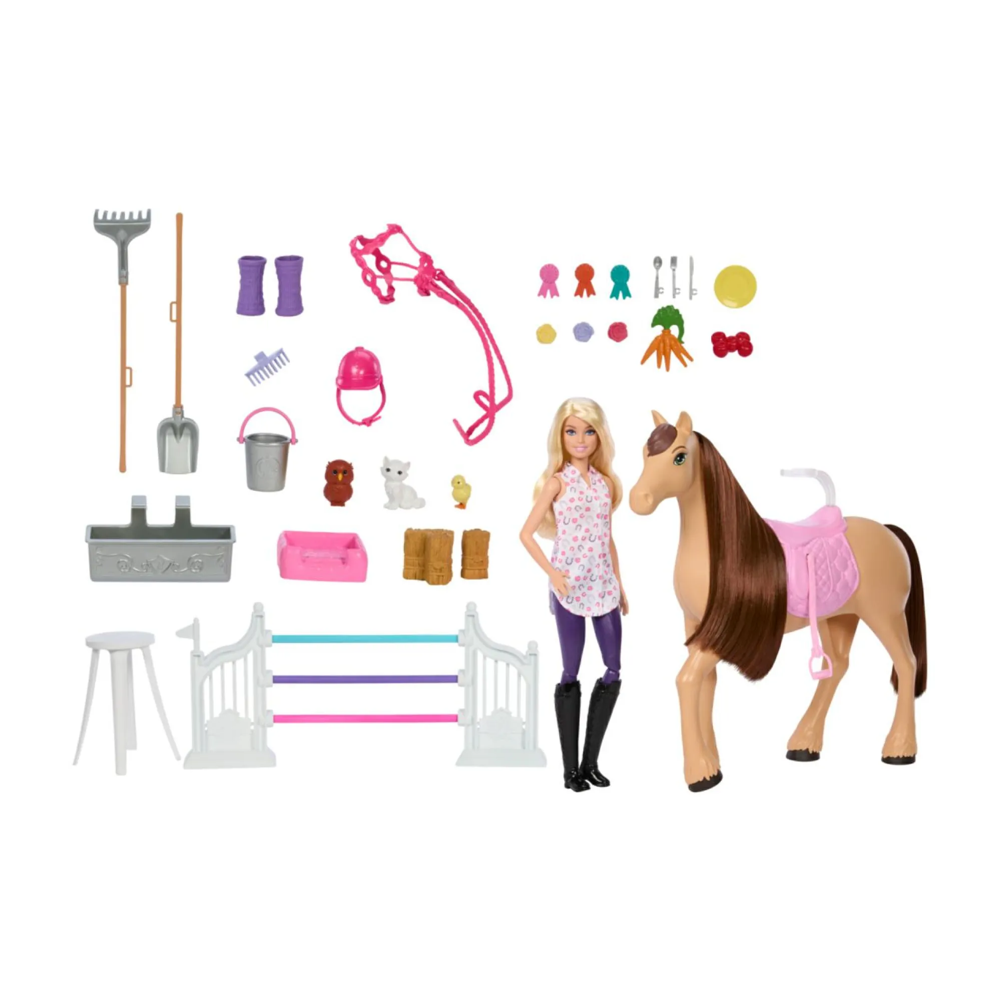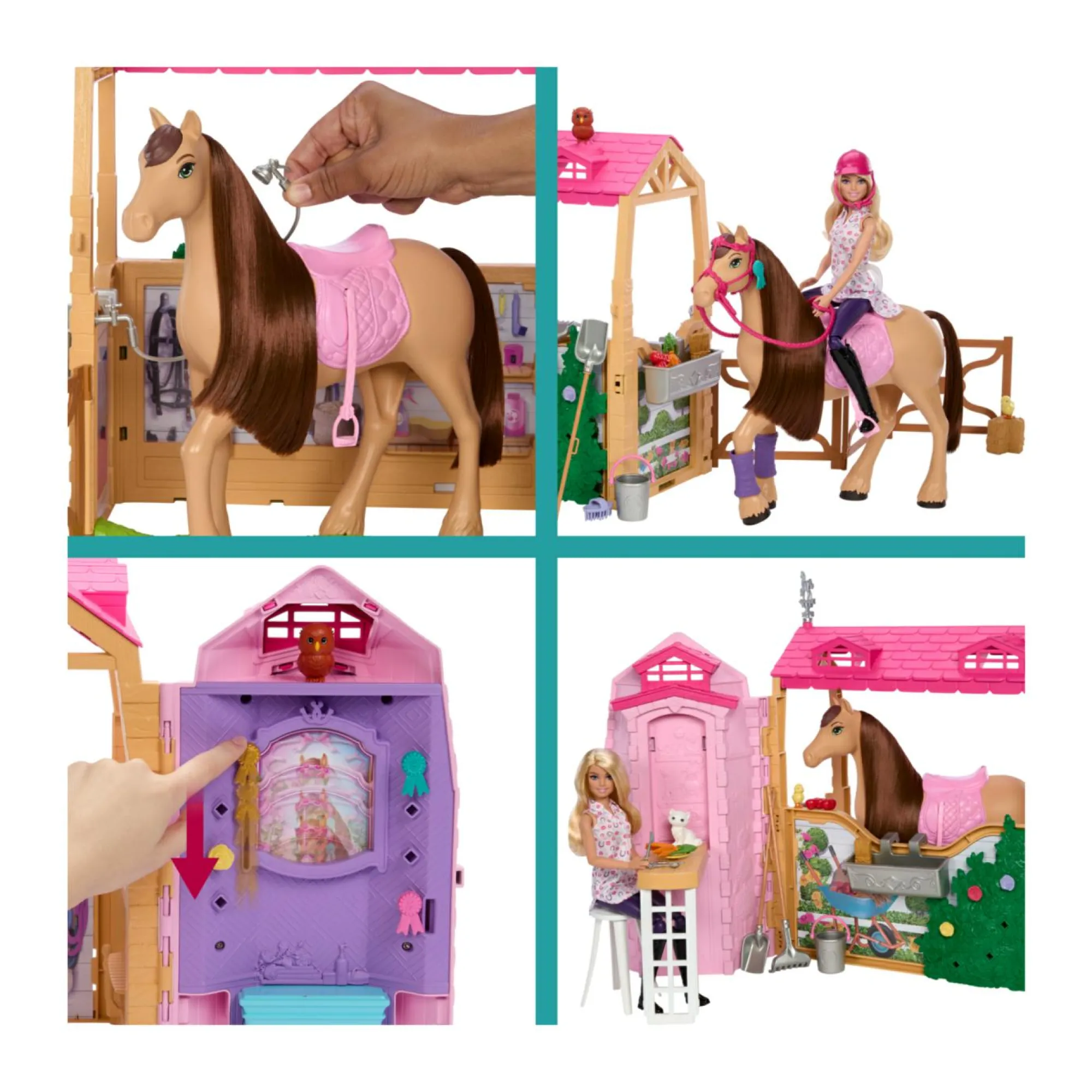 Prendiamoci cura del cavallo con Barbie nutrendolo con verdure alla stazione di alimentazione o pulendolo e spazzolandolo nella zona della toeletta.