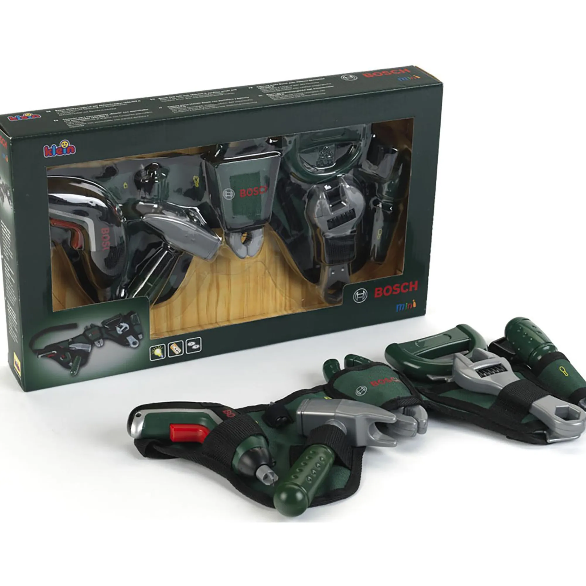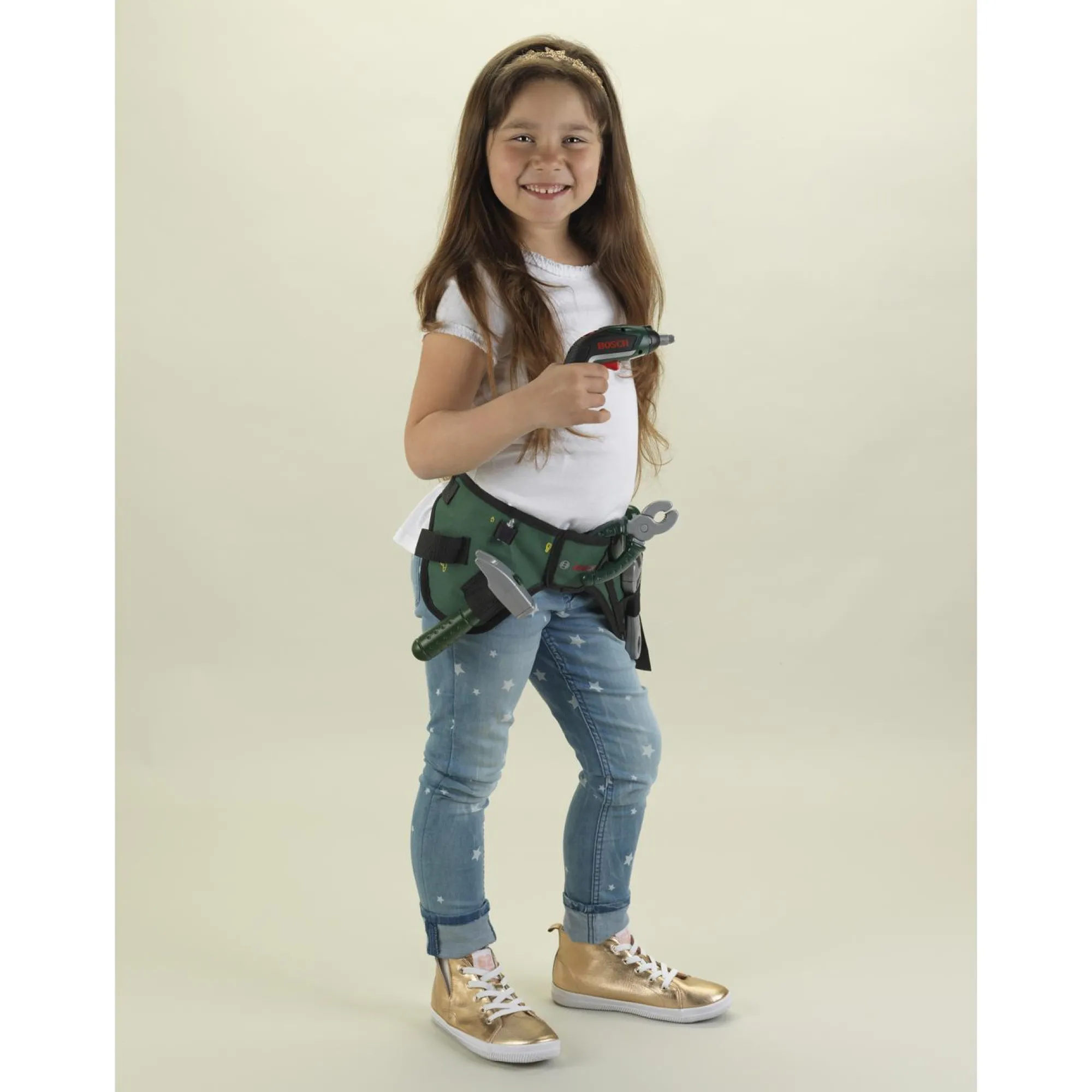 Cintura porta utensili con 6 accessori inclusi: un martello, una pinza, una sega, una chiave inglese regolabile, un cacciavite e un avvitatore.