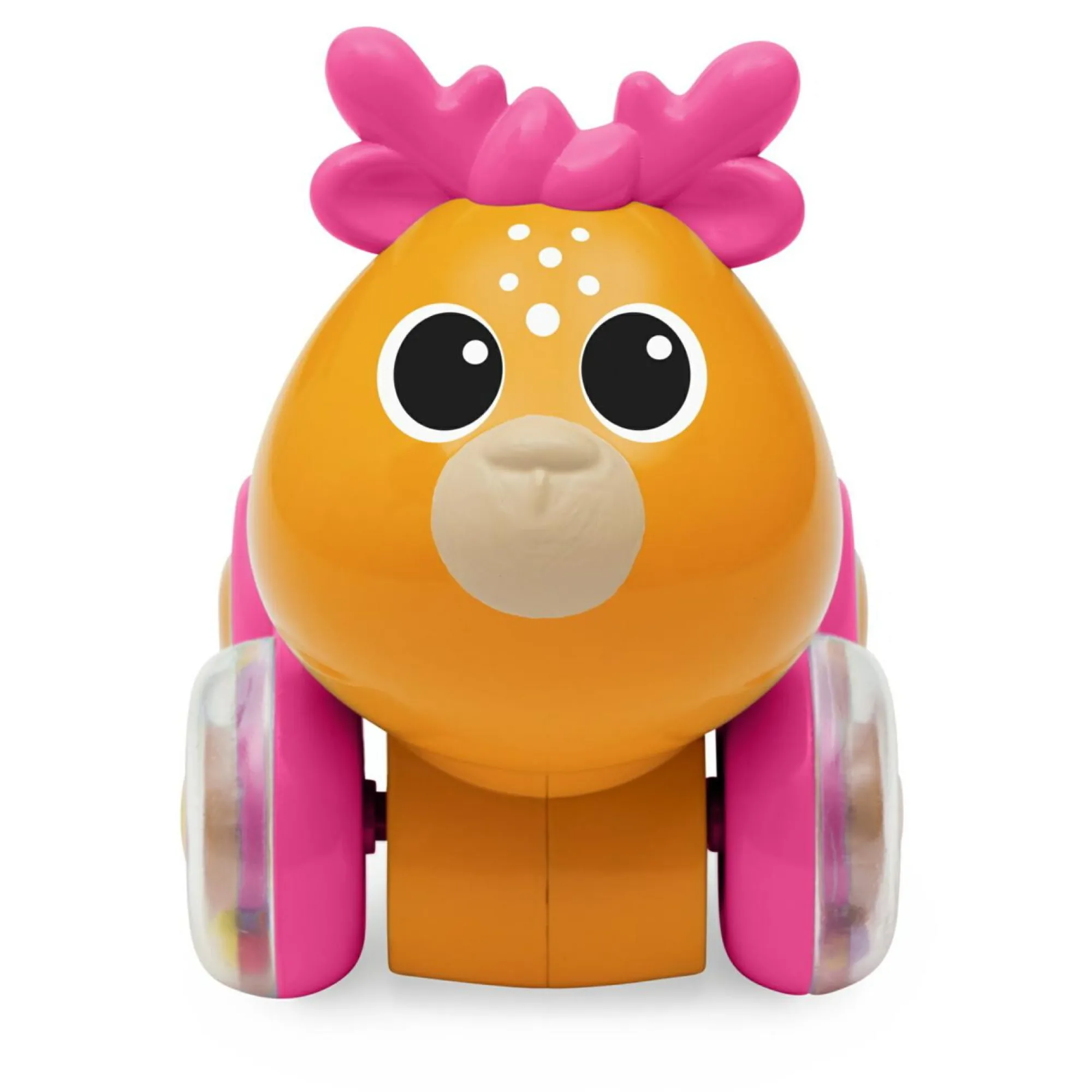 Le ruote posteriori in gomma garantiscono sicurezza, mentre quelle anteriori trasparenti incantano con suoni e colori.