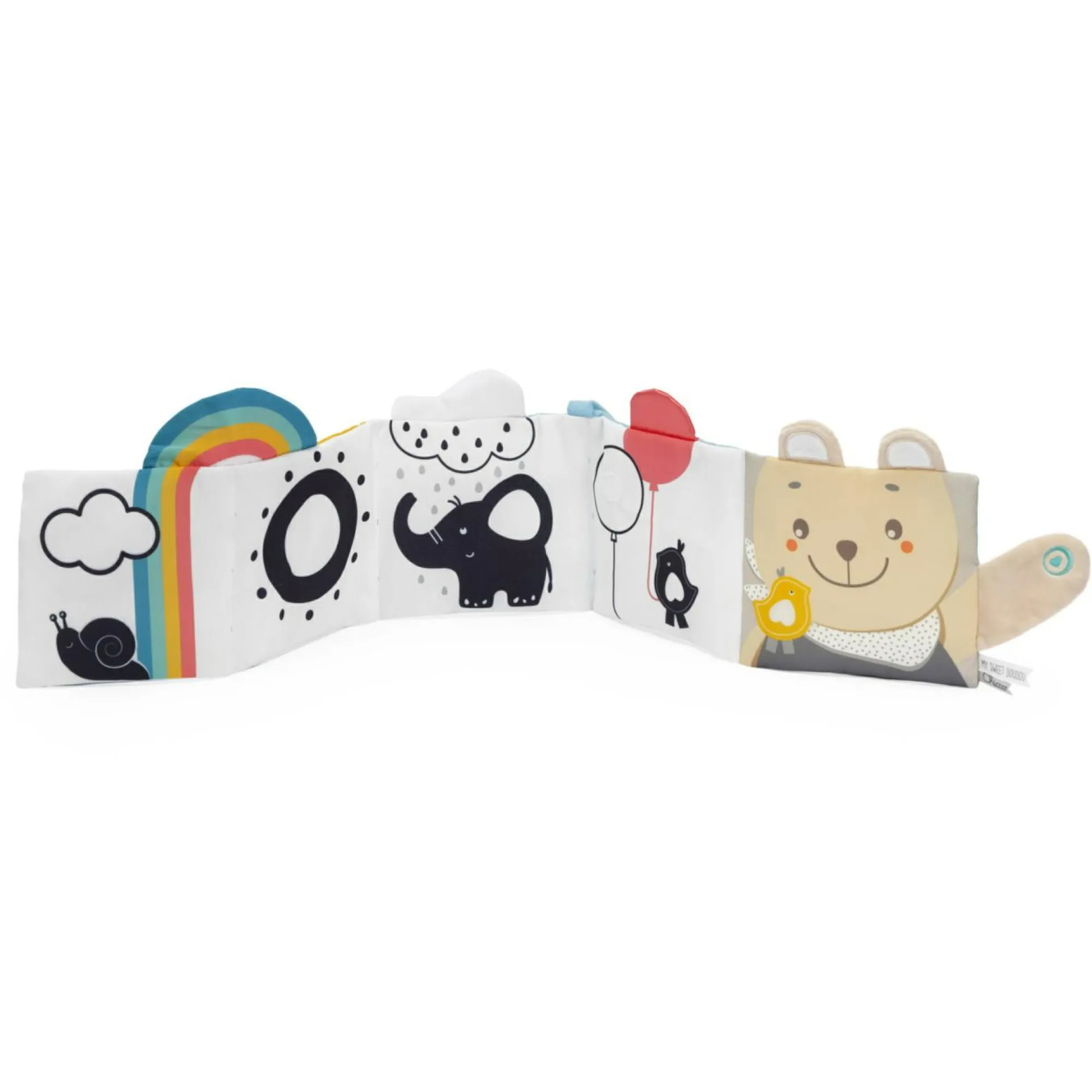 Libretto in tessuto morbido con immagini colorate e in bianco e nero, ideale per i neonati.
