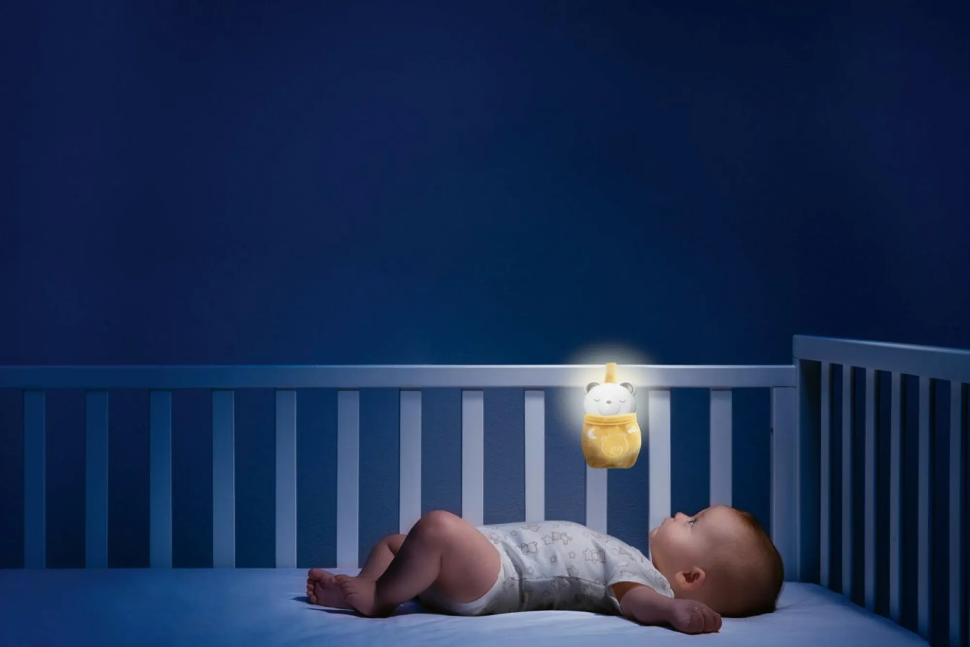 Modalità notte: inserendo il trillino all’interno del suo soffice sacchettino nanna e premendo il tasto centrale si attivano musiche rilassanti accompagnate da luci soffuse.