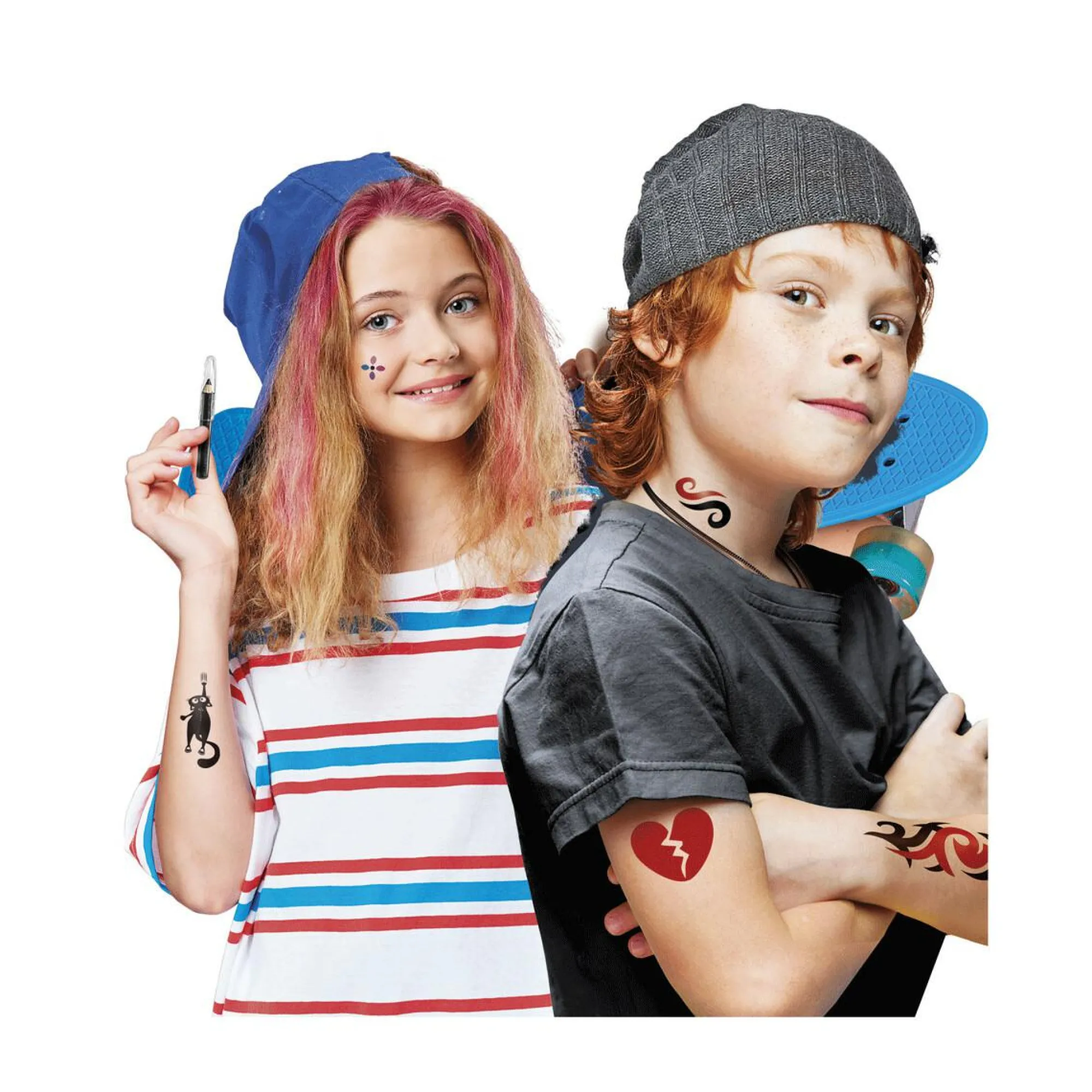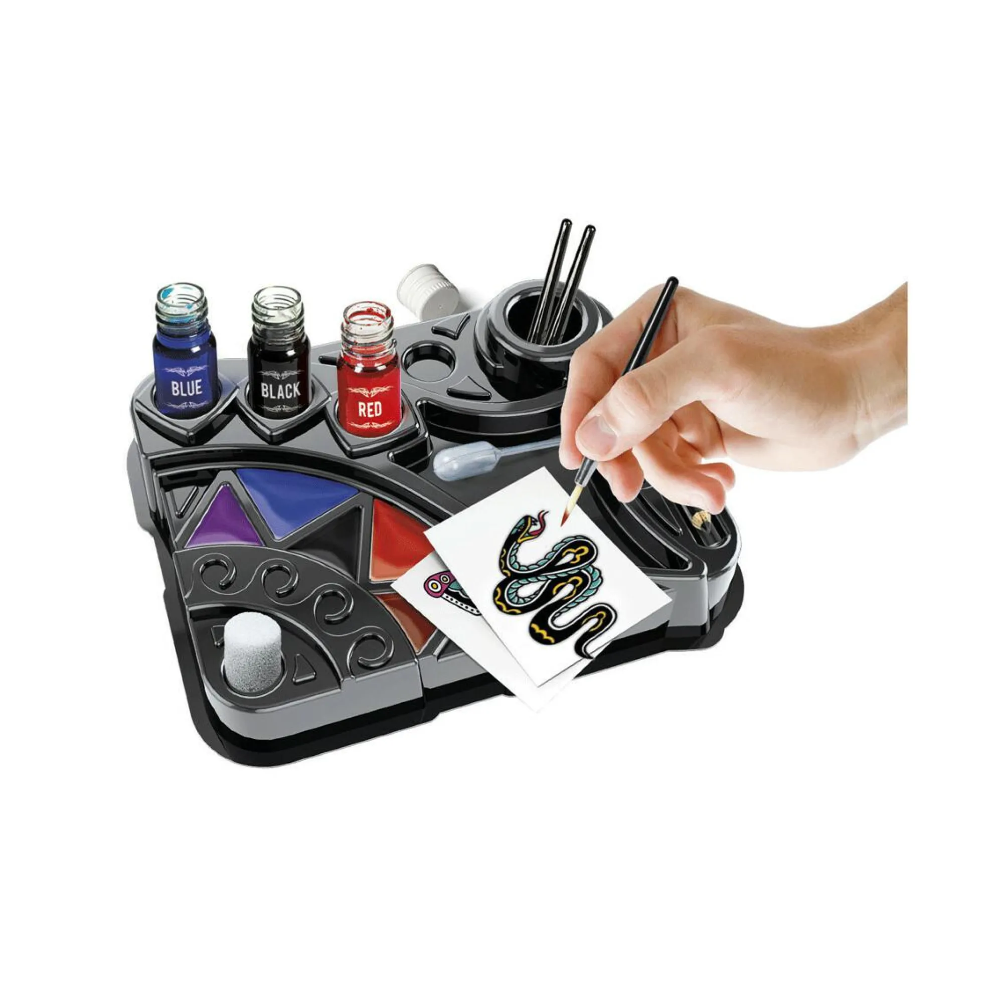 Un laboratorio, ma anche un incredibile set con tutto il necessario per realizzare tatuaggi alla moda! Contiene un banchetto da lavoro, pennelli, coloranti liquidi e stencil per realizzare tatuaggi a mano libera proprio come un vero tatuatore! Il manuale spiega passo passo come realizzare i tatuaggi, guidando il bambino in un’esperienza di gioco divertente e coinvolgente