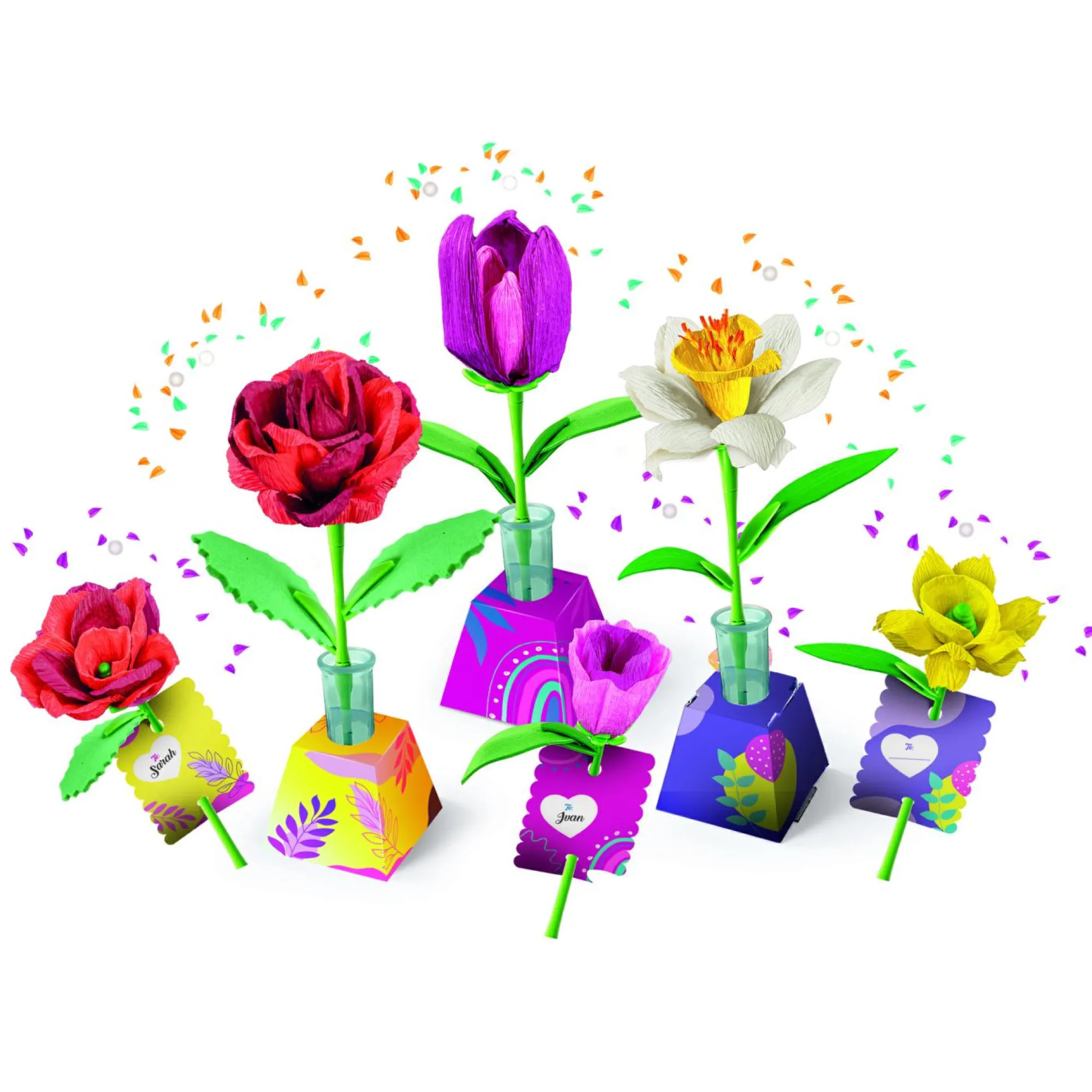 Un originale kit creativo che permette di assemblare 2 fiori e personalizzarli con diverse colorazioni, scegliendo tra 3 tipi di fiori: rosa, tulipano e narciso.