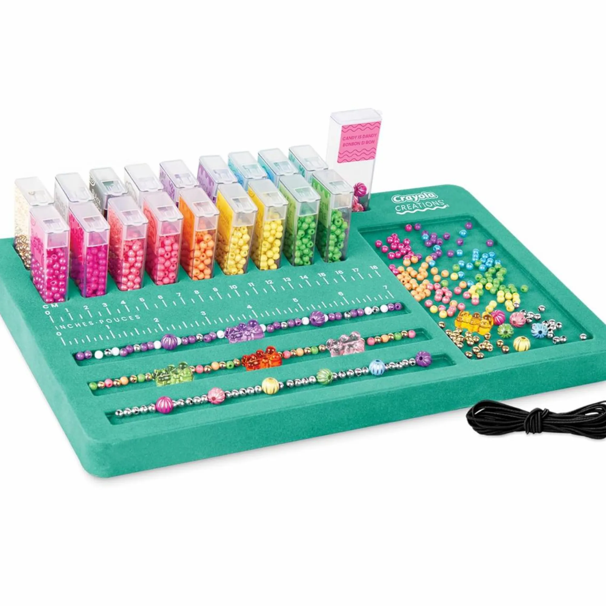 TUTTO IN ORDINE: le perline sono racchiuse in pratici dosatori inseriti negli appositi vani sulla base che comprende anche un pratico spazio con righello per misurare la giusta lunghezza del braccialetto