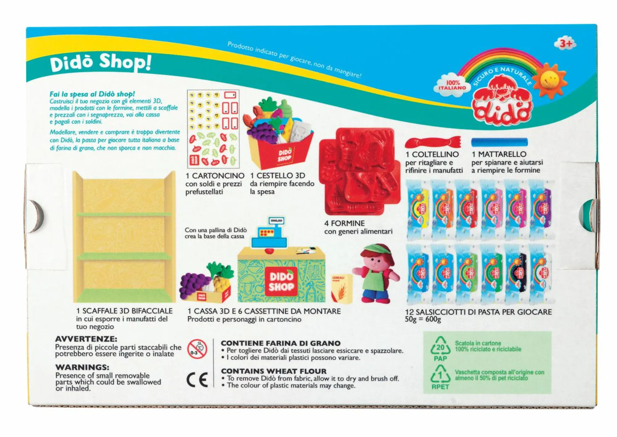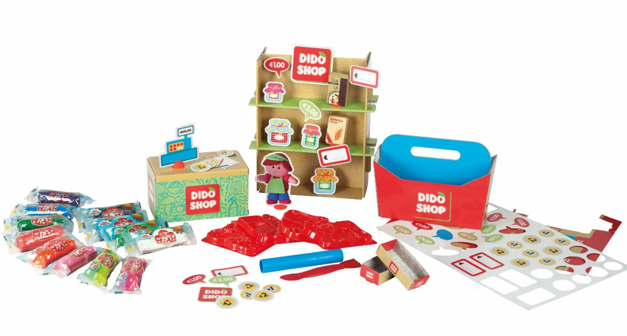 Un contenuto ricco di pasta per giocare per modellare i prodotti, costruire un negozio in cartotecnica e giocare a vendere e comprare.