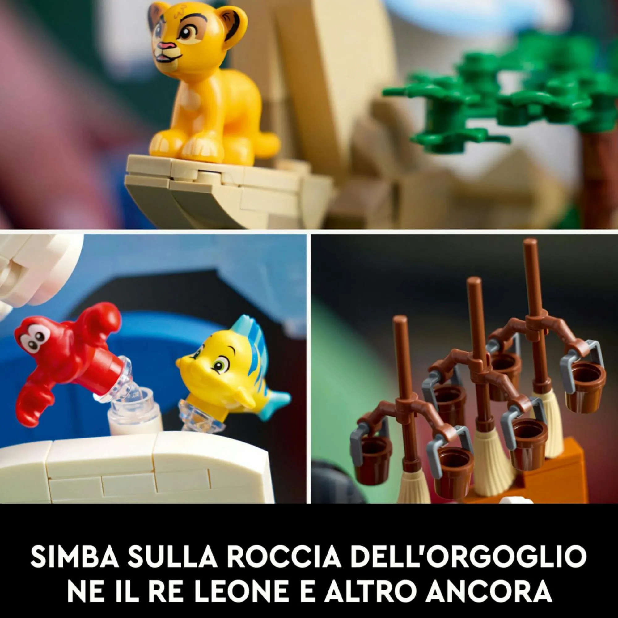 Famosi personaggi Disney: il set include un personaggio Disney di Topolino da costruire, le minifigure di Belle, Geppetto, Bruno e Lilo, oltre ai personaggi di Simba, Sebastian, Flounder e 3 scope