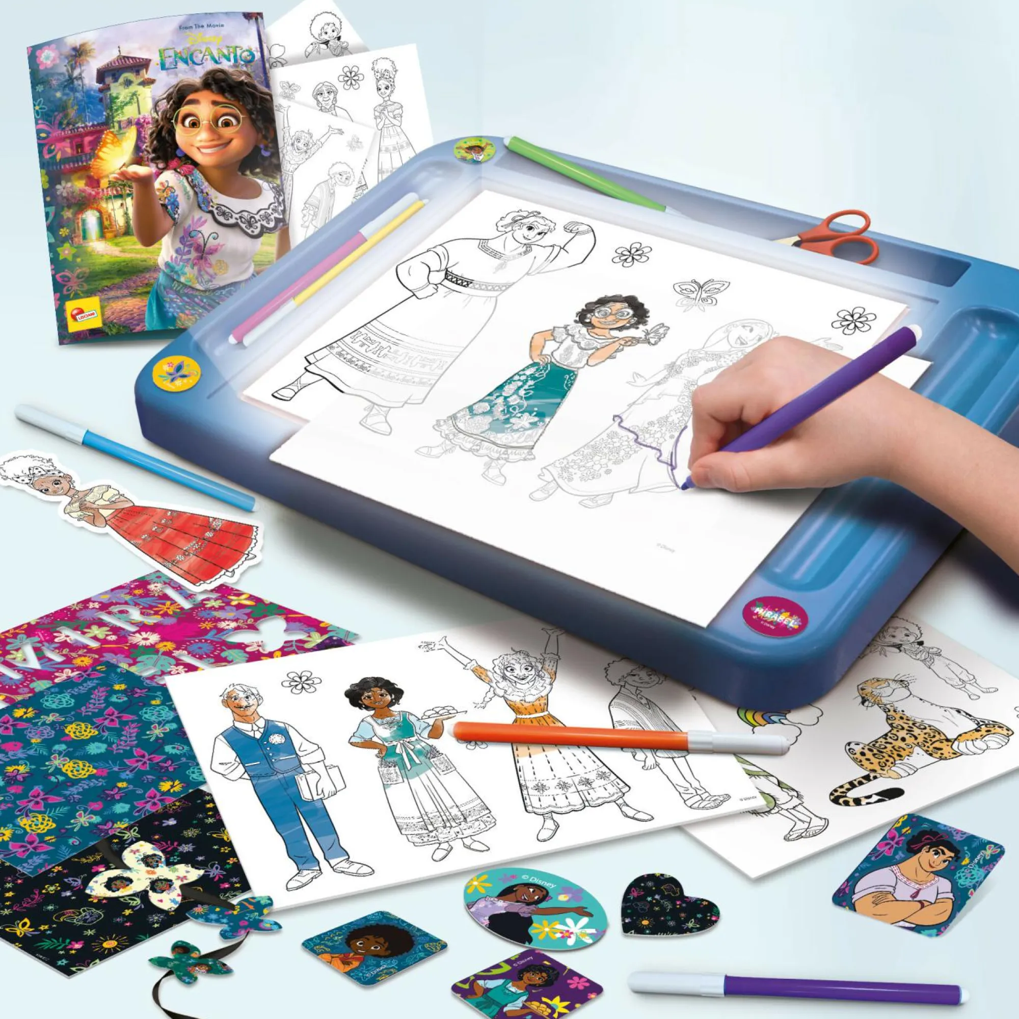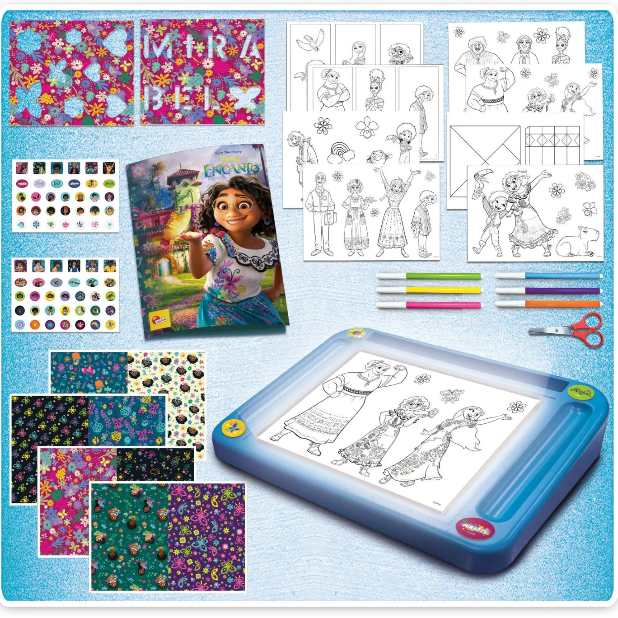 CONTENUTO: tavolino luminoso, pennarelli, cartellina, pattern, stickers, schede attività, manuale di istruzioni