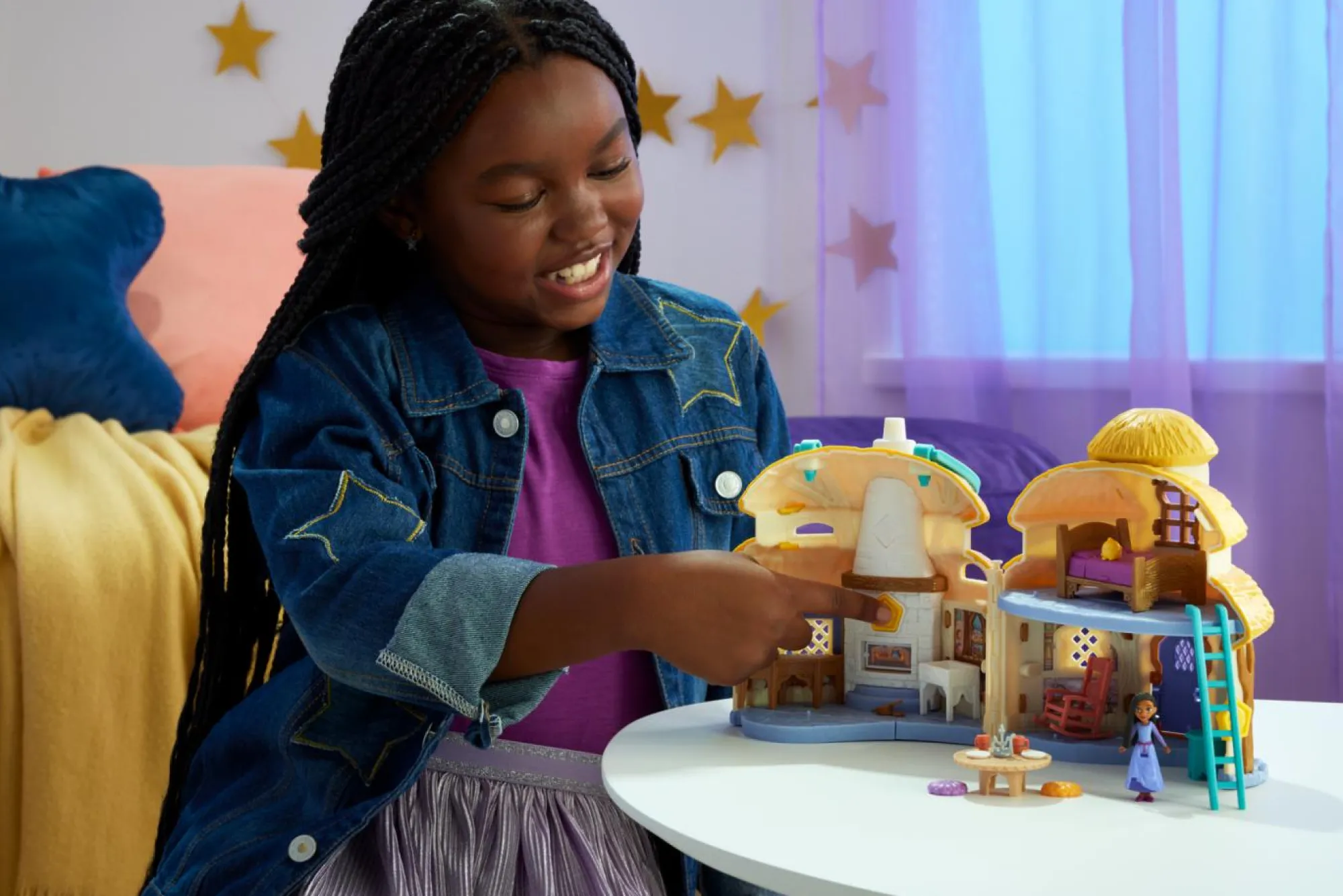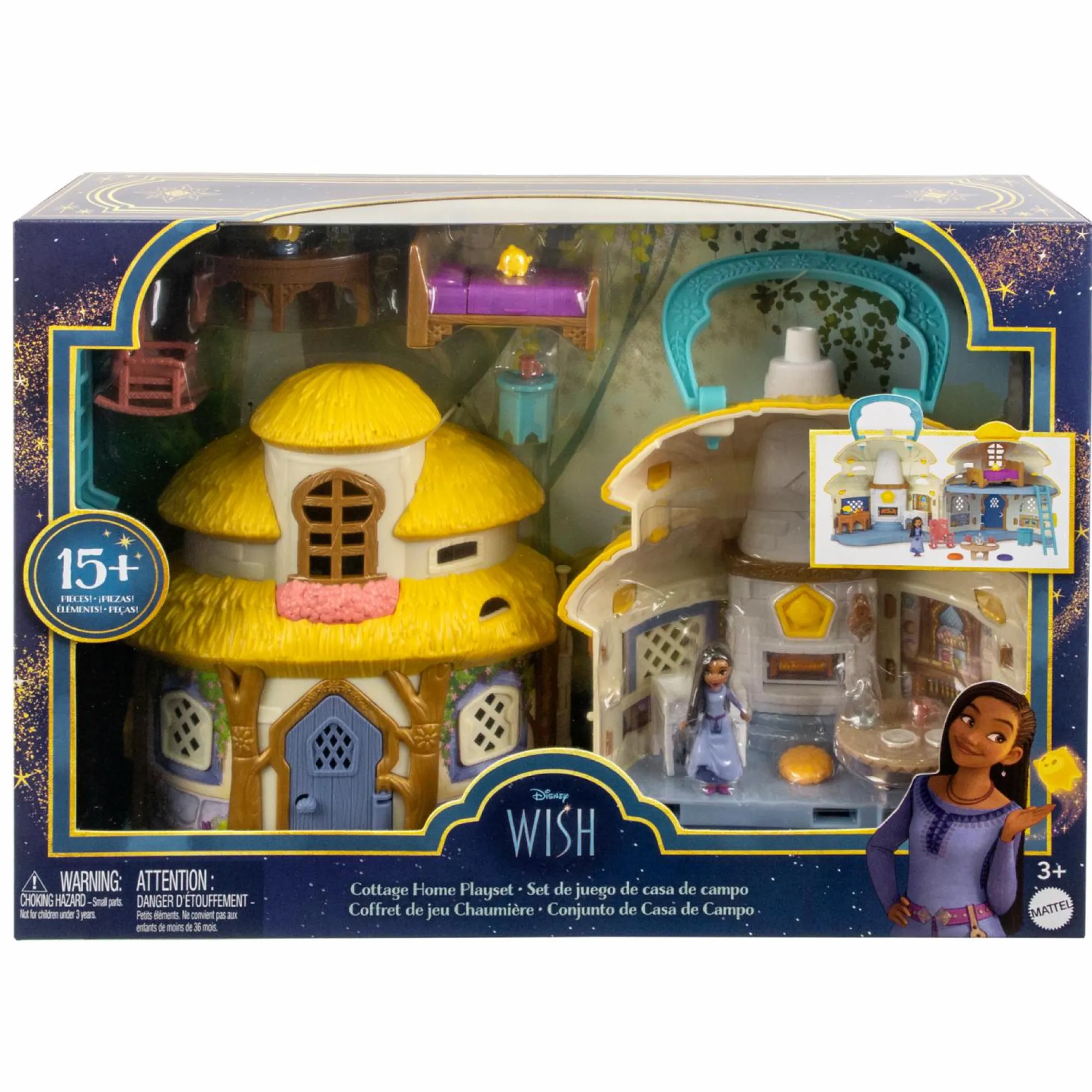 Ispirato all’ambientazione del film, premi il pulsante Star Sorprese Magiche per aprire il playset portatile e scoprire il cottage a 2 piani che Asha chiama casa!