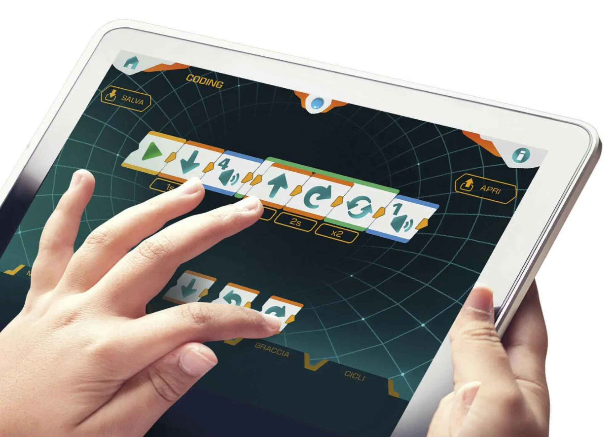 App dedicata con diverse funzionalità: Real time per comandare il Robot in tempo reale, Coding per apprendere le basi della programmazione e MEMO per sfidare il Robot in un gioco di memoria. Grazie alle braccia mobili il robot può sollevare e spostare piccoli oggetti.