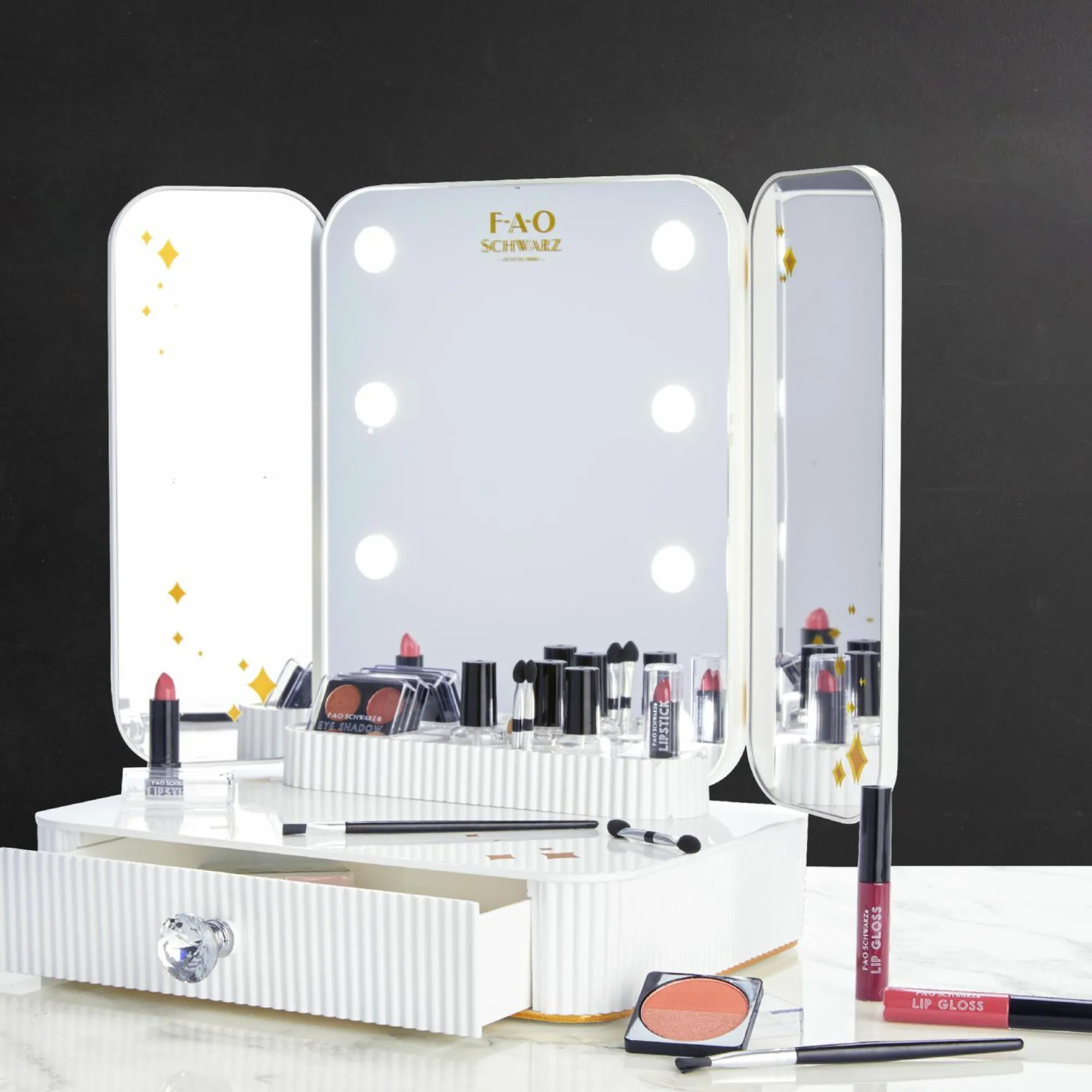 Crea uno spazio vanity personale solo per tuo figlio con il questo kit con specchio LED a tre ante e il vano con cassetti incluso