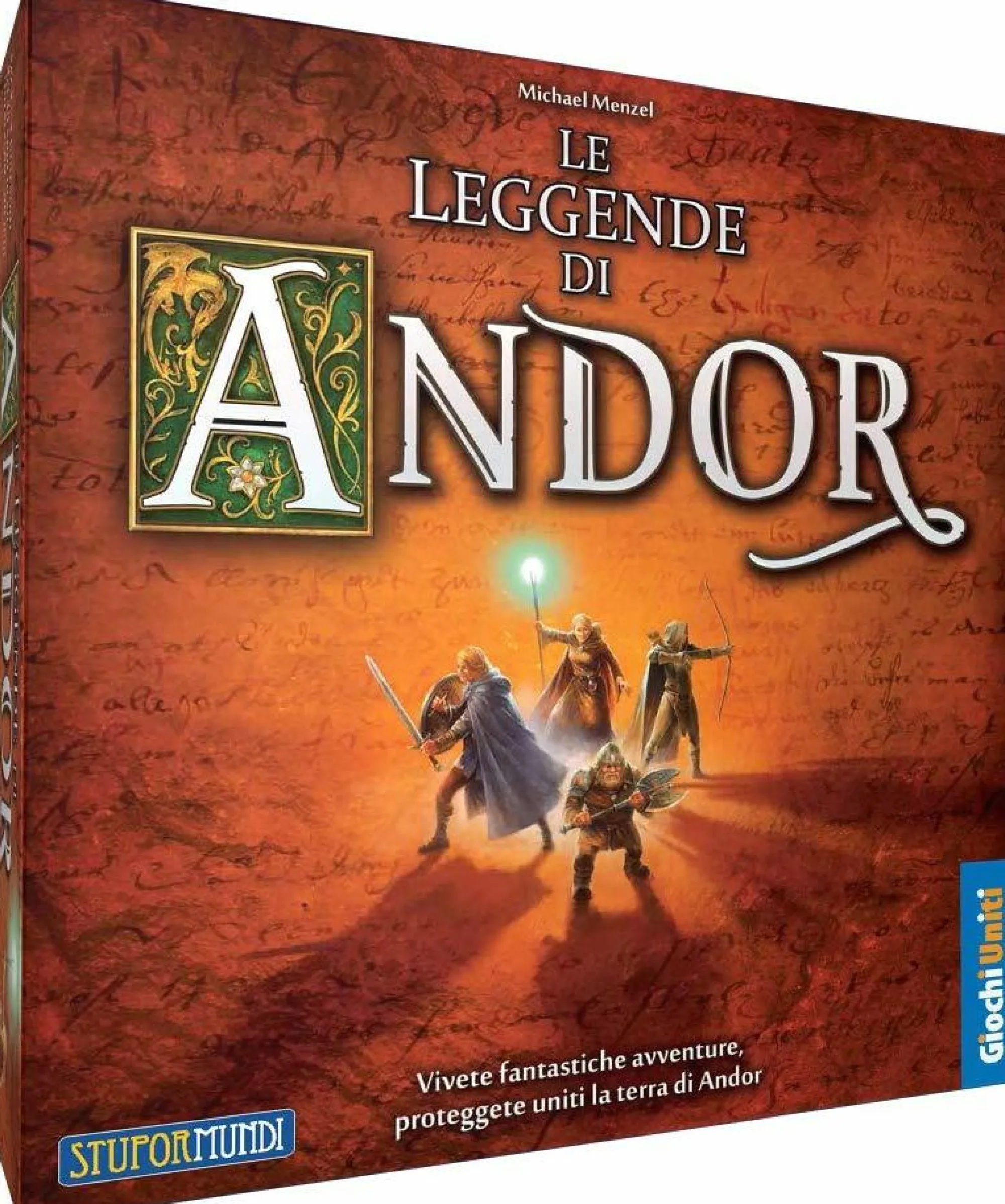 La leggendaria terra di Andor è in pericolo! Dalle montagne e dalle foreste mostruosi nemici si dirigono al castello; solo un piccolo gruppo di eroi si oppone ad essi con la spada, con l’arco, con l’ascia e con la magia. Ogni giocatore sceglie uno dei quattro Eroi e lo muove sulla mappa ad aree che rappresenta la terra di Andor. Insieme agli altri si prodiga per scongiurare il pericolo rappresentato dai mostri e dai loro comandanti ed aiutare il regno salvando alcune volte il Re, altre volte i contadini. Il gioco è organizzato in leggende, ognuna scritta su un certo numero di carte; queste introducono le regole particolari, determinano l’apparizione dei mostri e gli eventi casuali che gli Eroi devono affrontare. Per la prima partita un’avventura introduttiva aiuta a familiarizzare con le regole base. Ogni leggenda genera una partita diversa e per alcune si utilizza la mappa che si trova sul retro del tabellone: la Miniera abbandonata. Se l’aspetto narrativo di ogni leggenda è molto ben curato, l’aspetto tattico è sempre importante. Ogni Eroe ha una propria scheda. Su questa sono segnate le sue caratteristiche e le sue regole speciali; qui il giocatore può seguire il miglioramenti del proprio personaggio e depositare gli equipaggiamenti, gli oggetti magici e i bonus acquisiti. Inoltre, gli Eroi possono contare su degli alleati fidati. Man mano che una leggenda avanza, si scoprono e si leggono tutte le carte che la compongono. Gli Eroi devono completare le missioni e gli obiettivi della leggenda prima che sia letta l’ultima carta; altrimenti perdono. Ogni Eroe nel proprio turno può compiere una sola azione e per compierla spende un certo numero di ore. Quando un Eroe ha terminato le ore di un giorno, deve aspettare che gli altri terminino le proprie ore prima di poter giocare ancora. A quel punto con un meccanismo automatico si muovono i mostri ed avanza la narrazione. Alcuni meccanismi casuali contribuiscono a rendere ogni partita differente. Man mano che la storia avanza gli Eroi scoprono che un malvagio stregone sta risvegliando il più antico nemico di Andor: il Drago che sarà il protagonista negativo delle ultime leggende. Grafiche eccezionali completano questo capolavoro del genere collaborativo. Gioco semplice, adatto per famiglie, che si spiega in pochi minuti e apprezzato anche da esperti giocatori appassionati di fantasy.
