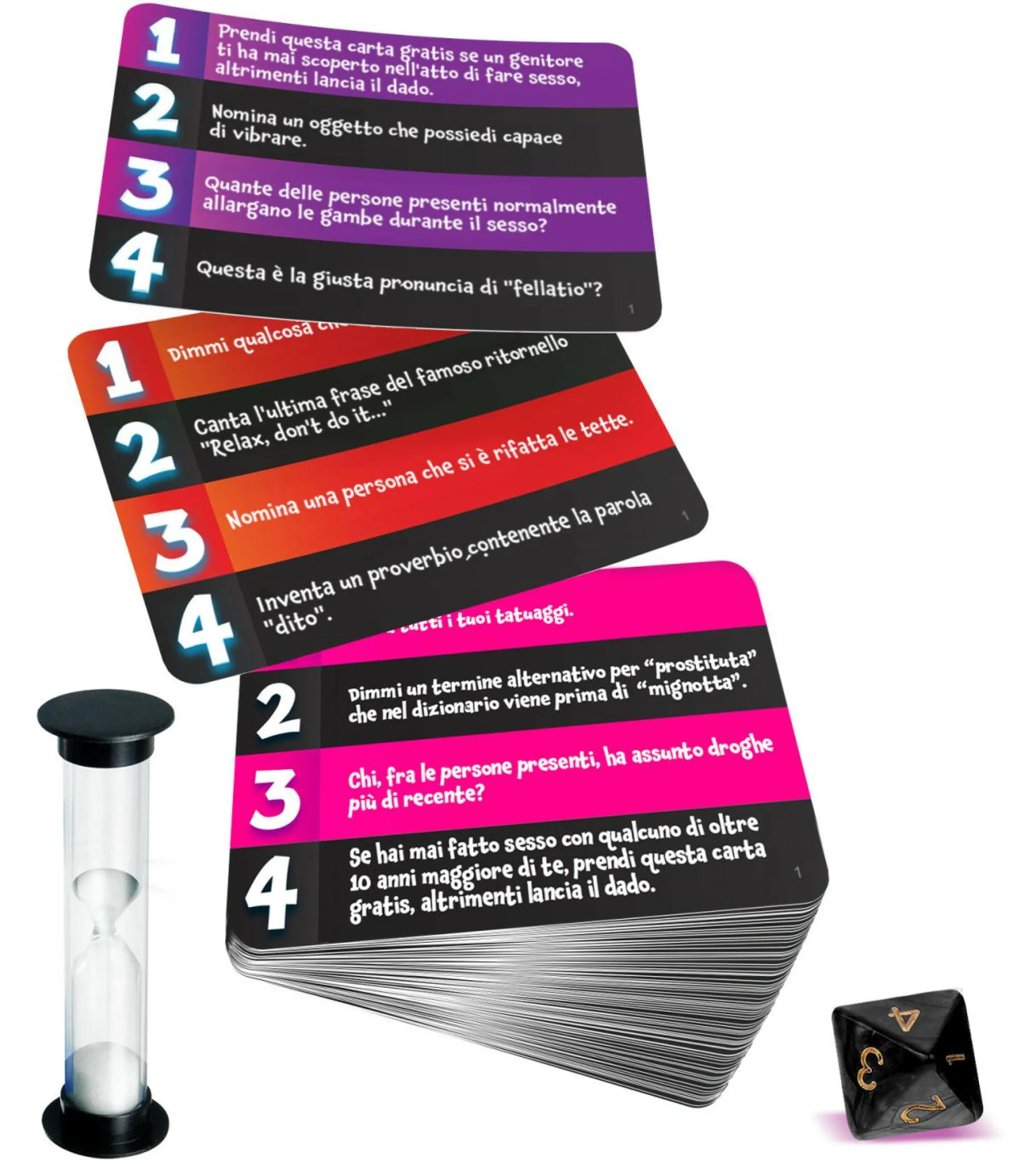 Ideale per feste e ritrovi tra adulti, si vince con prontezza di spirito e grande sfacciataggine nel rispondere a domande imprevedibili e scandalose. AVVISO IMPORTANTE: questo potrebbe essere il gioco più grezzo, spregiudicato, maleducato e politicamente scorretto con cui tu abbia mai giocato.