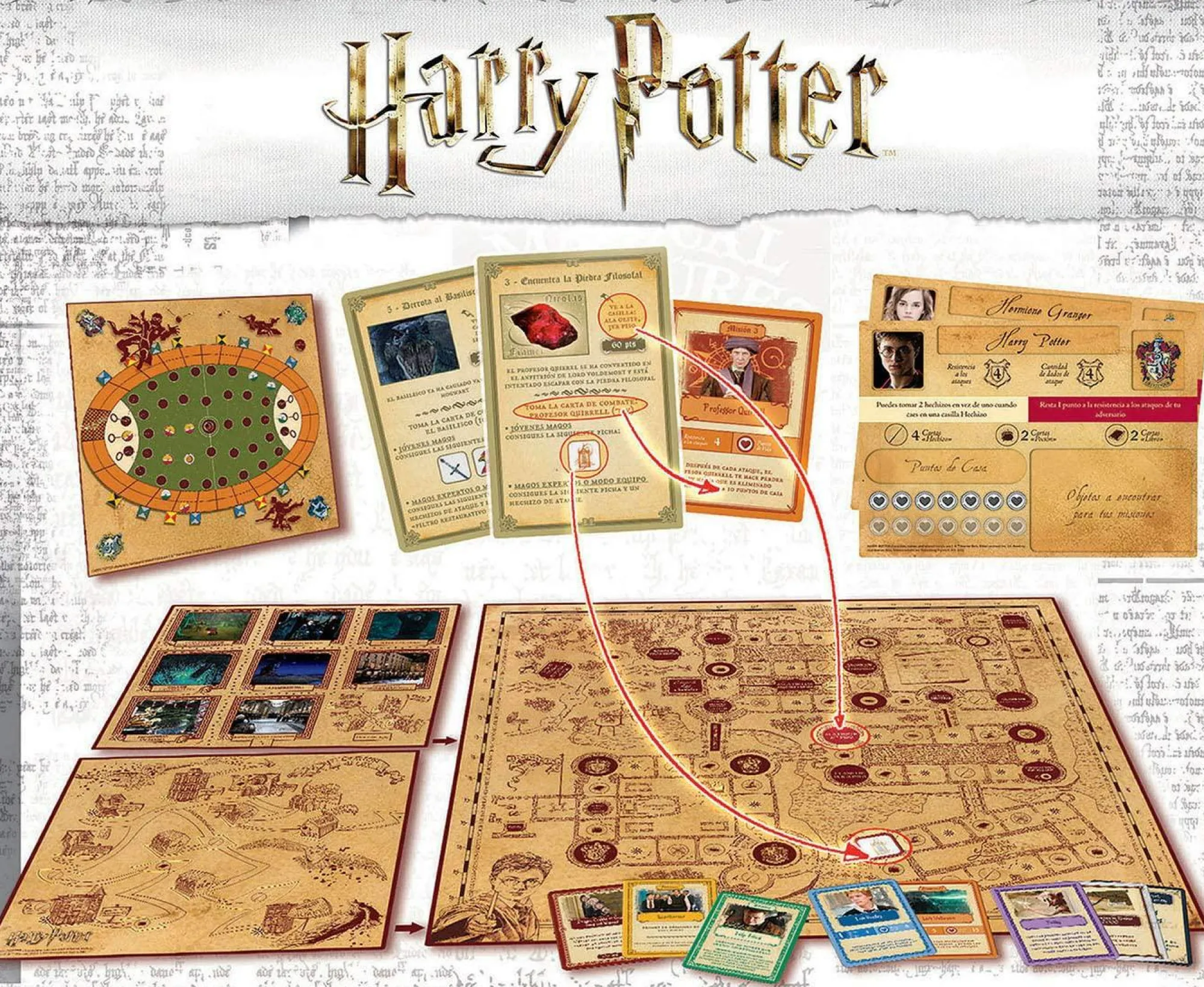 Contenuto del set: 1 tabellone principale, 1 tabellone delle posizioni, 1 tabellone Diagon Alley, 1 tabellone per quidditch, 210 carte (azione, combattimento, duello, eventi, libro, pozione, quidditch, incantesimo), 30 carte “missione”, 30 carte “oggetto”, 6 gettoni “mangiamorte”, 60 gettoni “coppa delle case”. “, 20 gettoni “polvere volante”, 10 gettoni “spostamento”, 70 gettoni per punti vita, 15 schede giocatori e 15 pedine giocatori