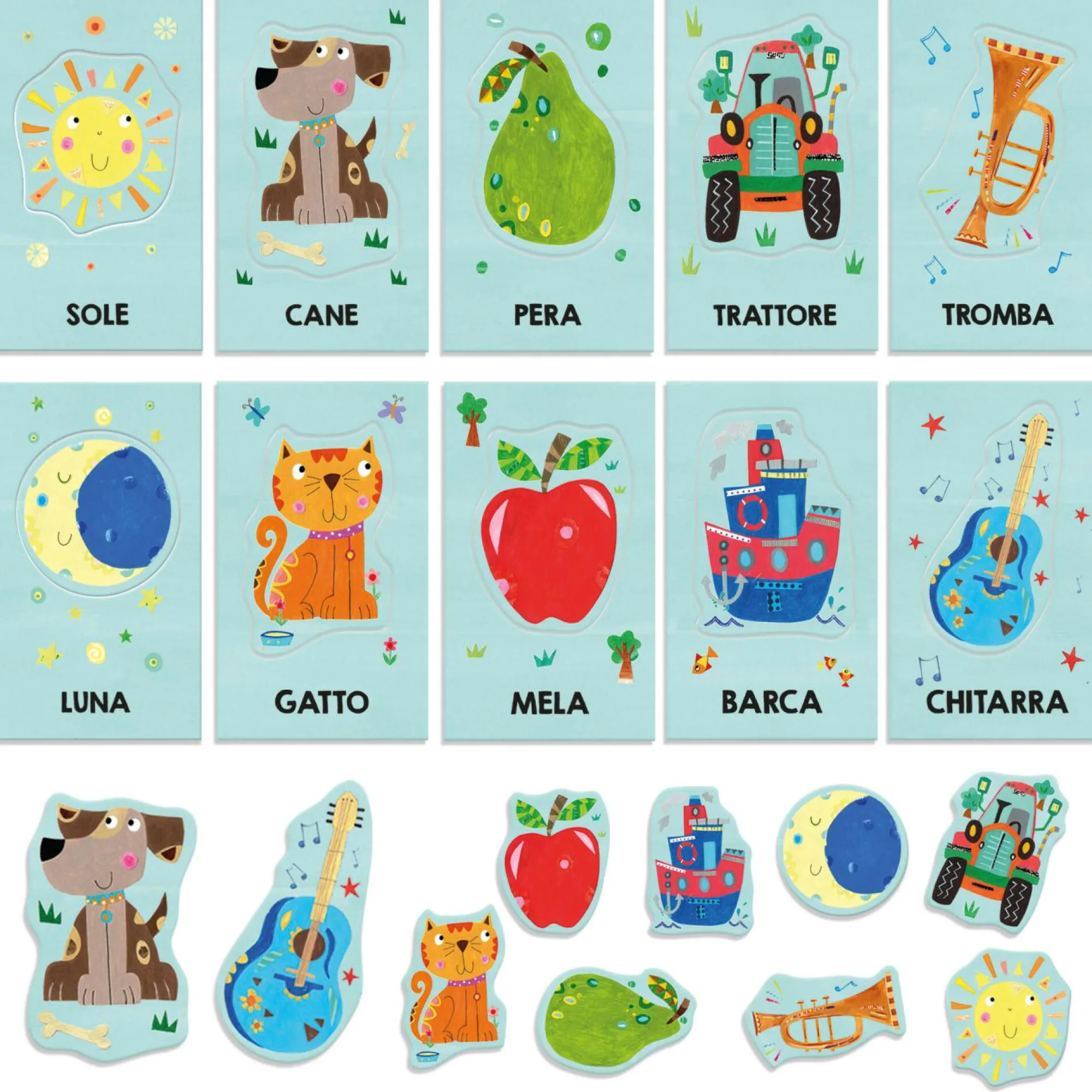 15 grandi carte • 15 sagome colorate • Istruzioni ad uso del genitore