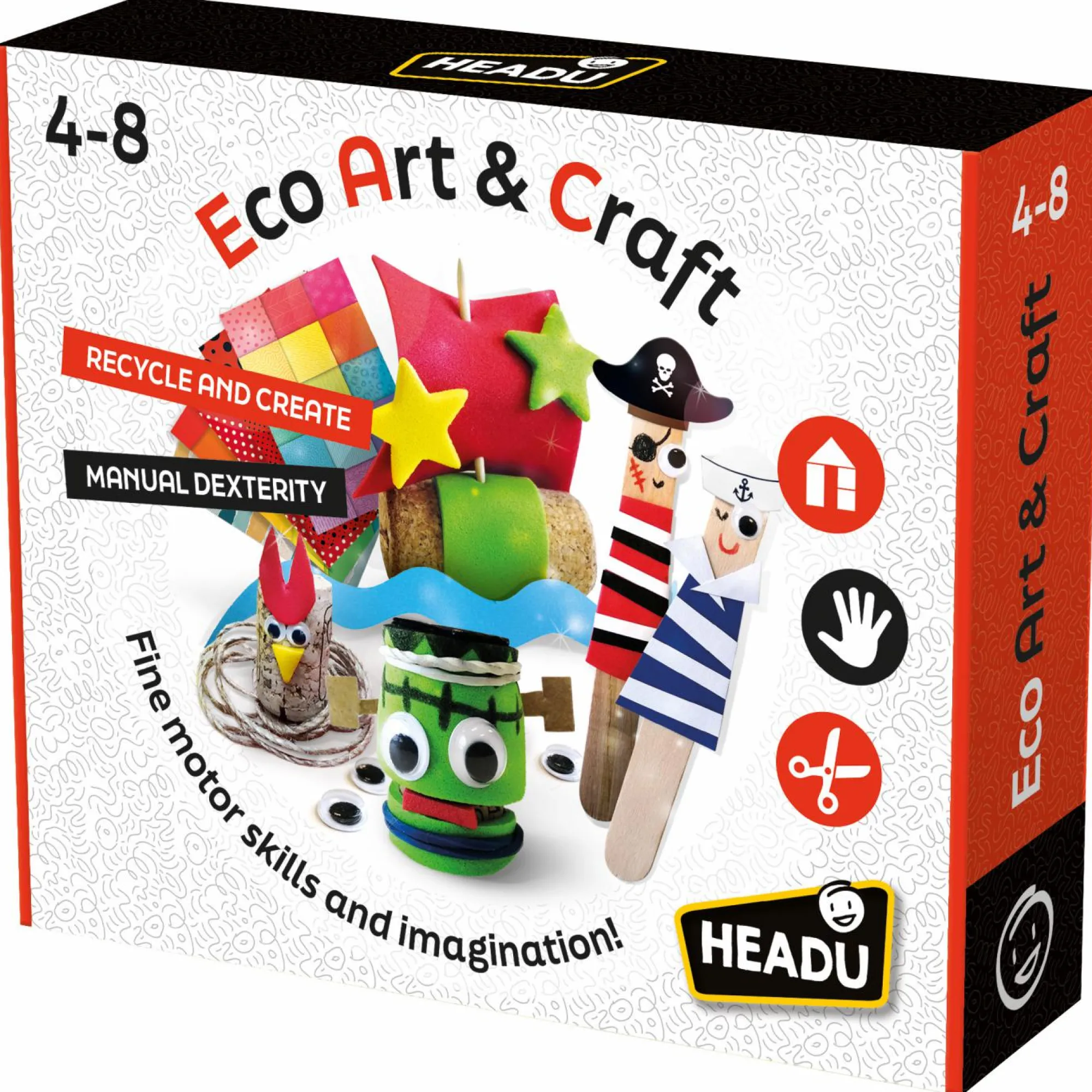 Cartoncino colorato; 16 pattern colorati; 2 tappi di sughero; 2 bastoncini di legno; Stickers in foam; 2 tappi di plastica; 1 metro di filo; 10 occhi di plastica adesivi; Forbicine