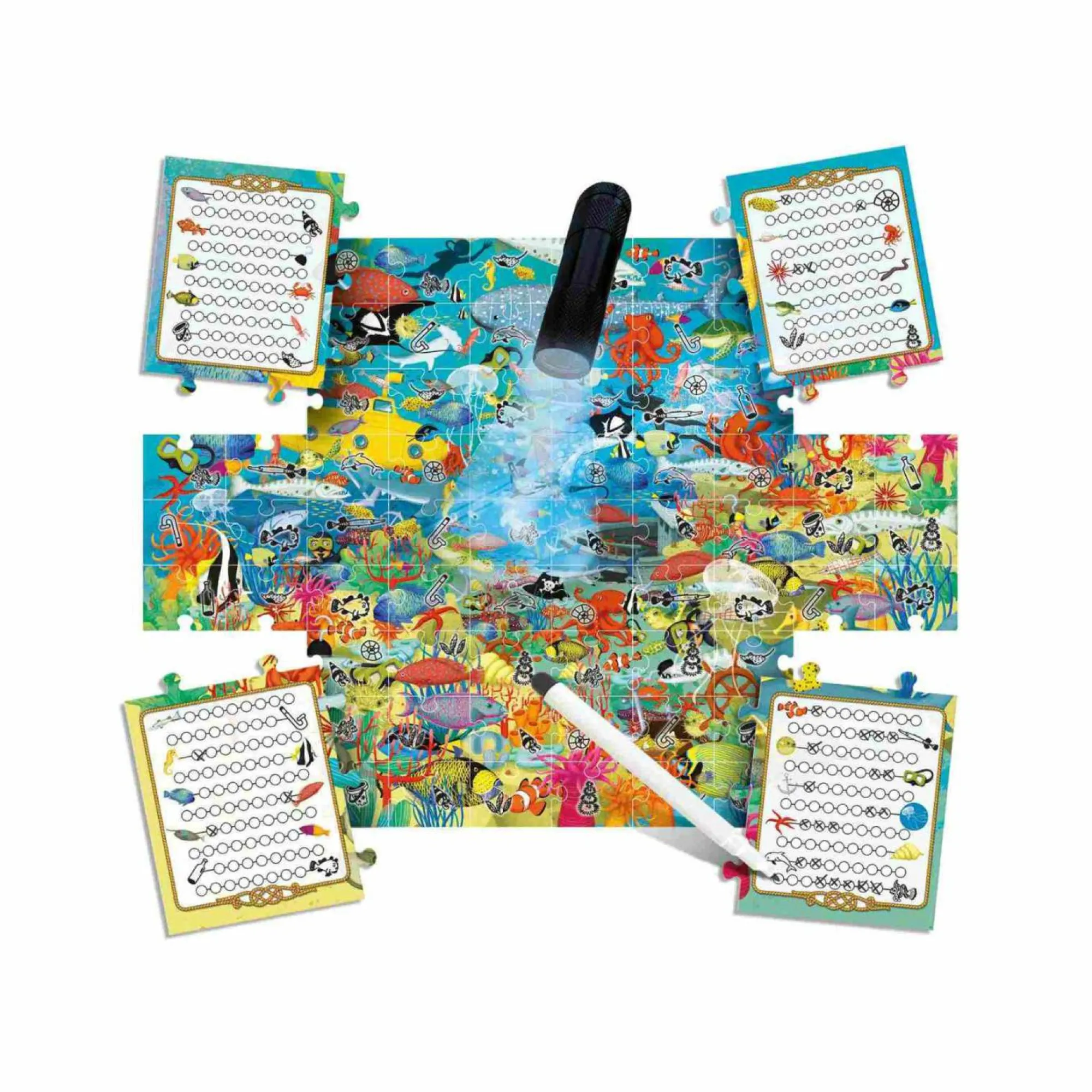 Puzzle 60 x 44 cm da 70 pezzi; Pennarello segna e cancella; Torcia UV (funziona con 3 pile AAA da 1,5 V non incluse)