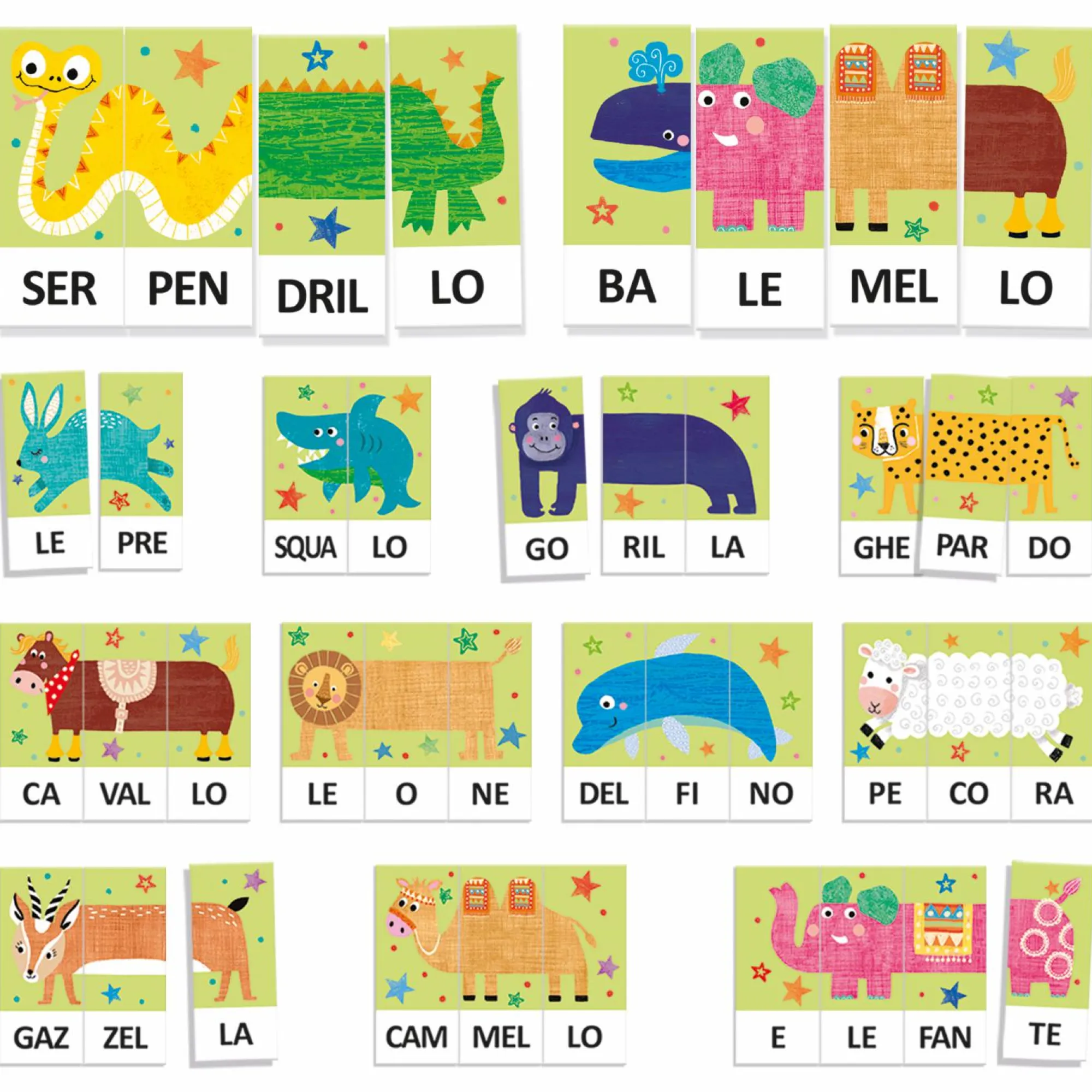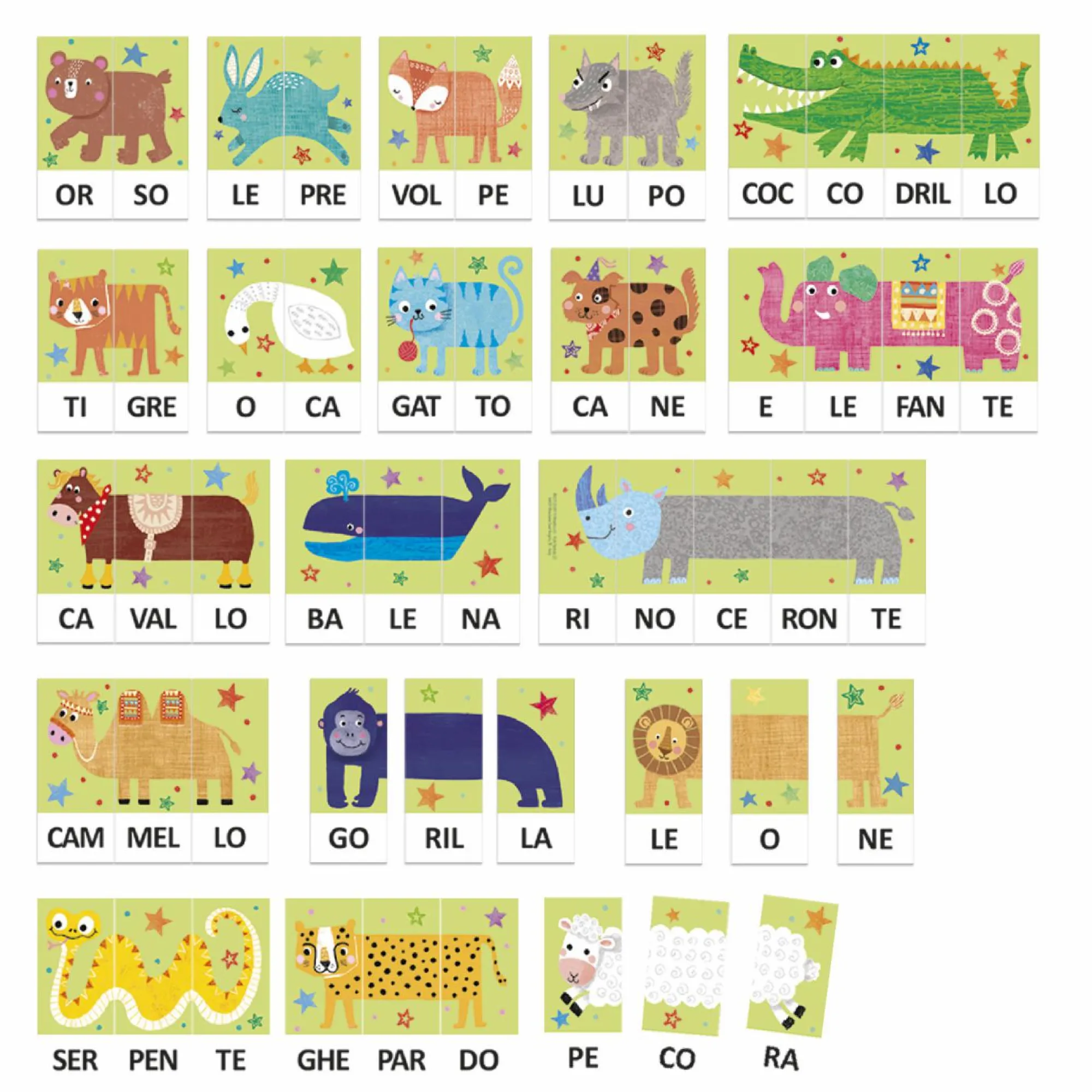 - Contenuto della confezione: 63 tasselli delle sillabe degli animali