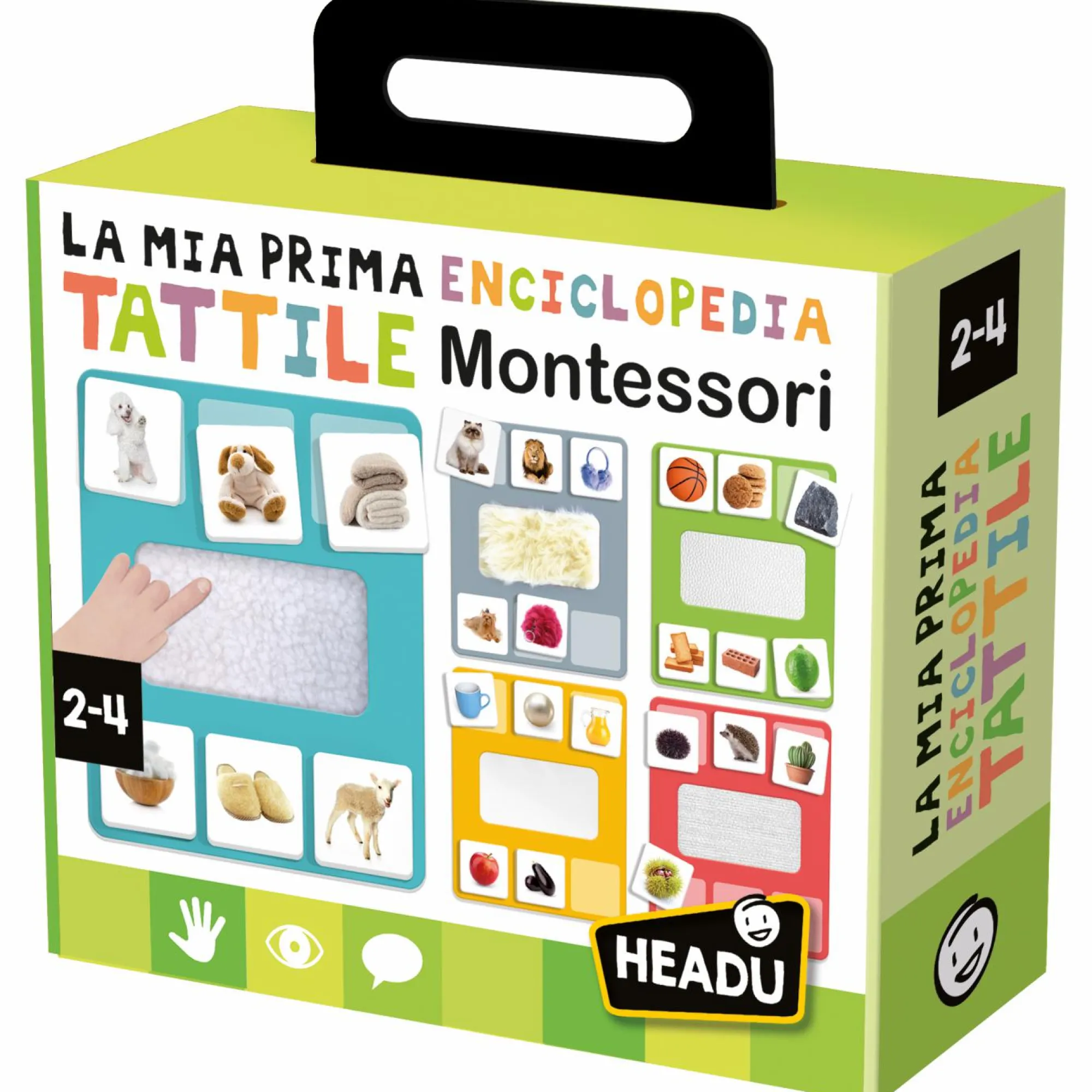 5 cartelle tattili della tombola; 30 tessere soggetti; 6 tessere premio; Istruzioni