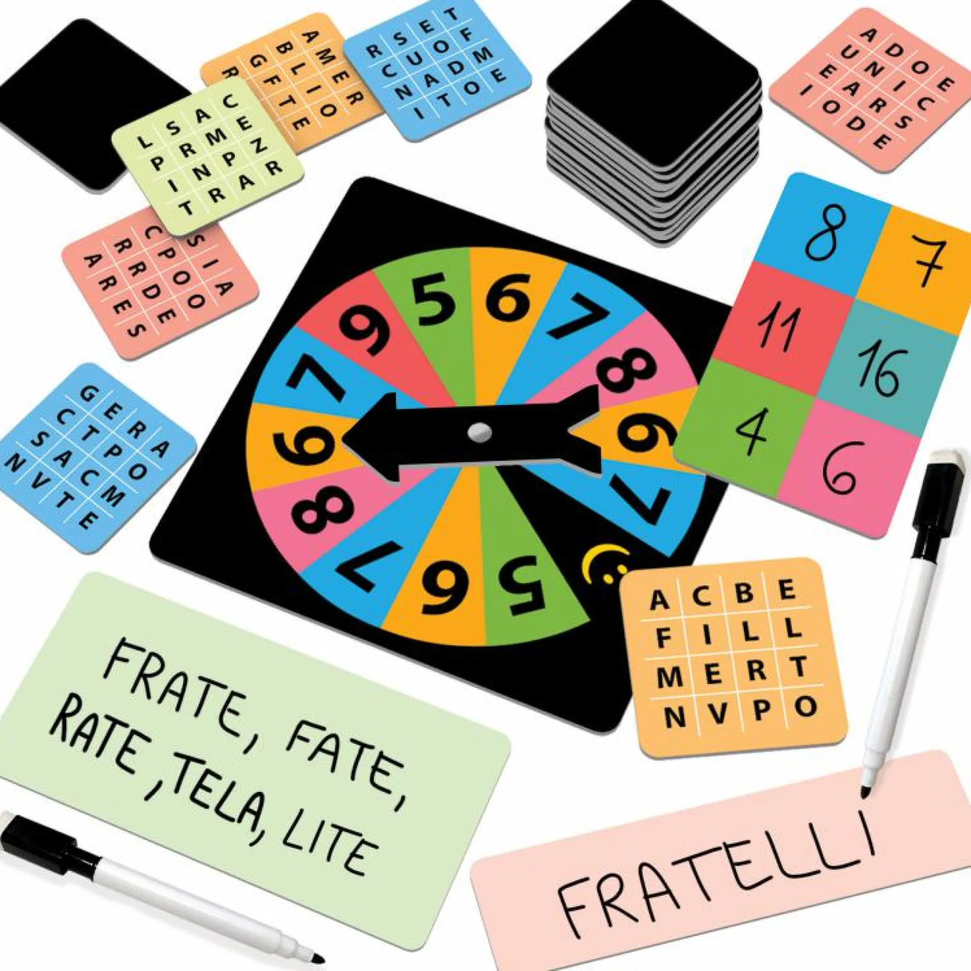 45 Cartine-lettere; 1 spinner; 1 clessidra; 2 lavagnette; 2 pennarelli1 schedina-punteggio; Regolamento