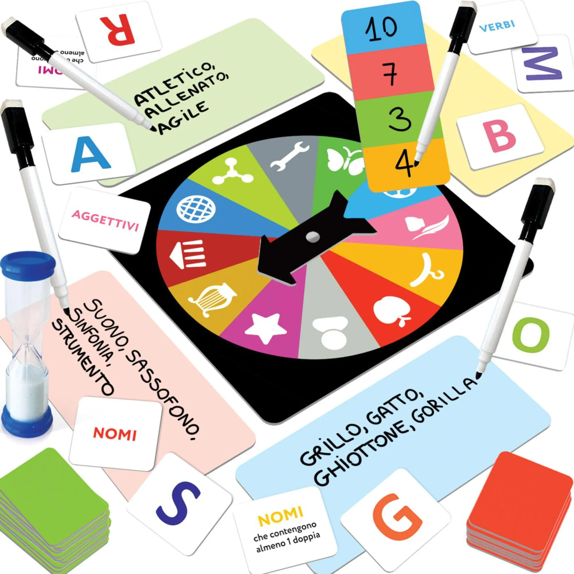 30 cartine-lettera; 30 cartine attività; 1 spinner; 4 lavagnette; 4 pennarelli cancellabili; 1 clessidra; 1 scheda segnapunti