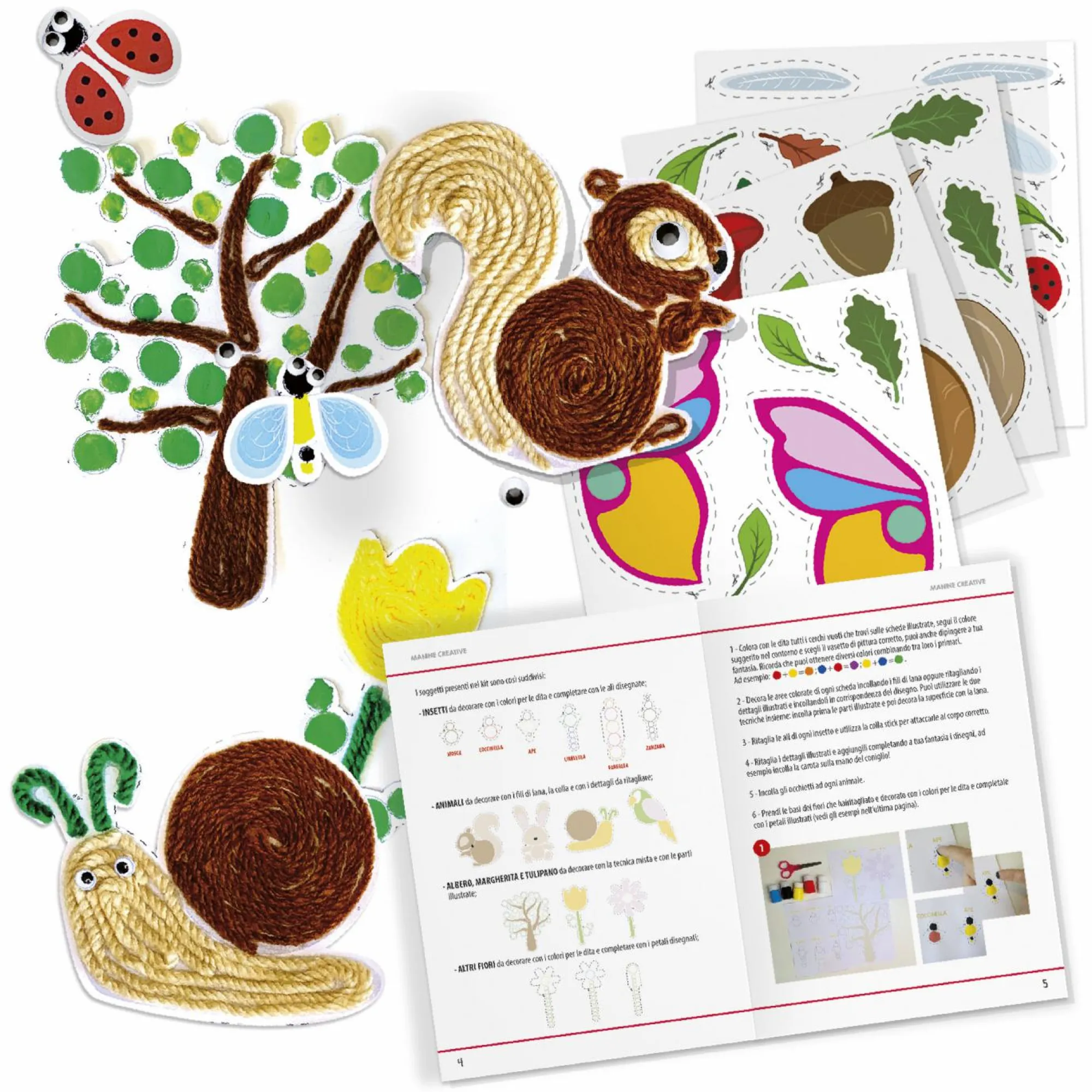 5 barattoli di finger paint; Occhietti adesivi; Colla stick; Cartoncino colorato; Fili di lana; Istruzioni