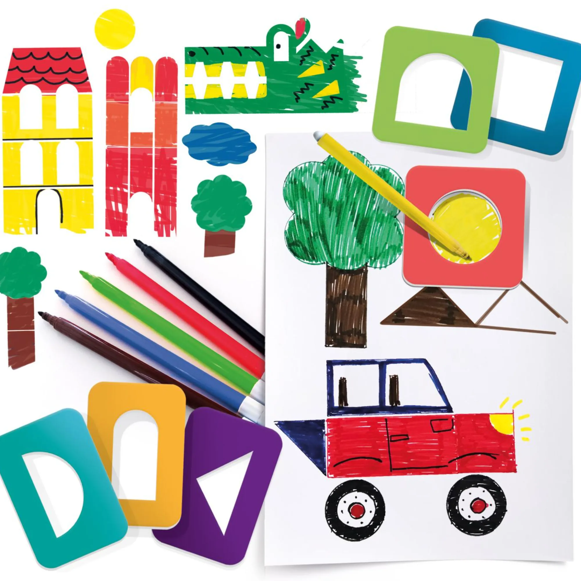 35 stencil; 35 forme; 6 pennarelli colorati; Libretto per disegnare con istruzioni di gioco