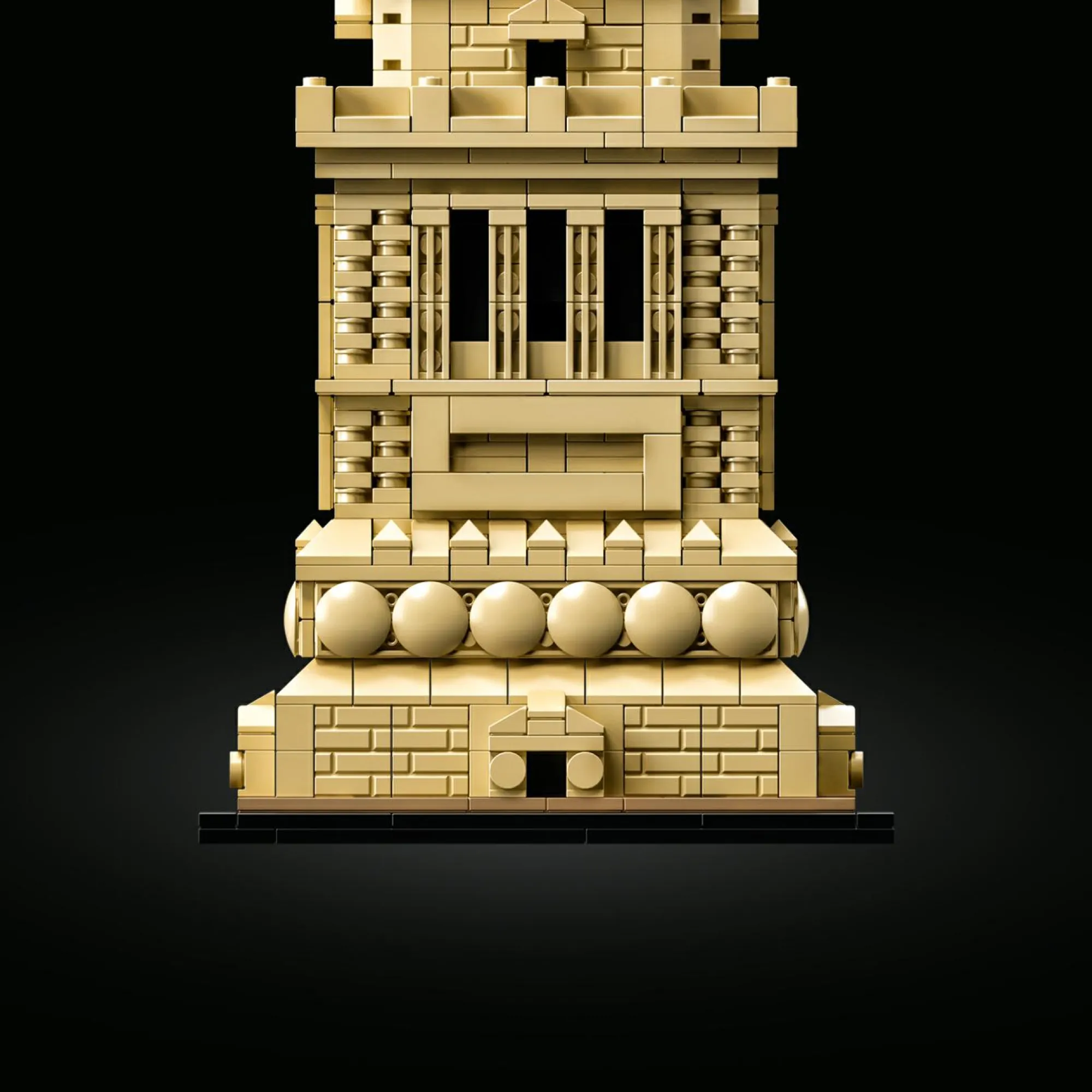 • Modello dotato di basamento intricato con scudi, dettagli in mattoncini e balconi colonnati, e una statua con toga, catene spezzate, corona a 7 punte, libro e braccio alzato che sorregge una fiaccola dorata.