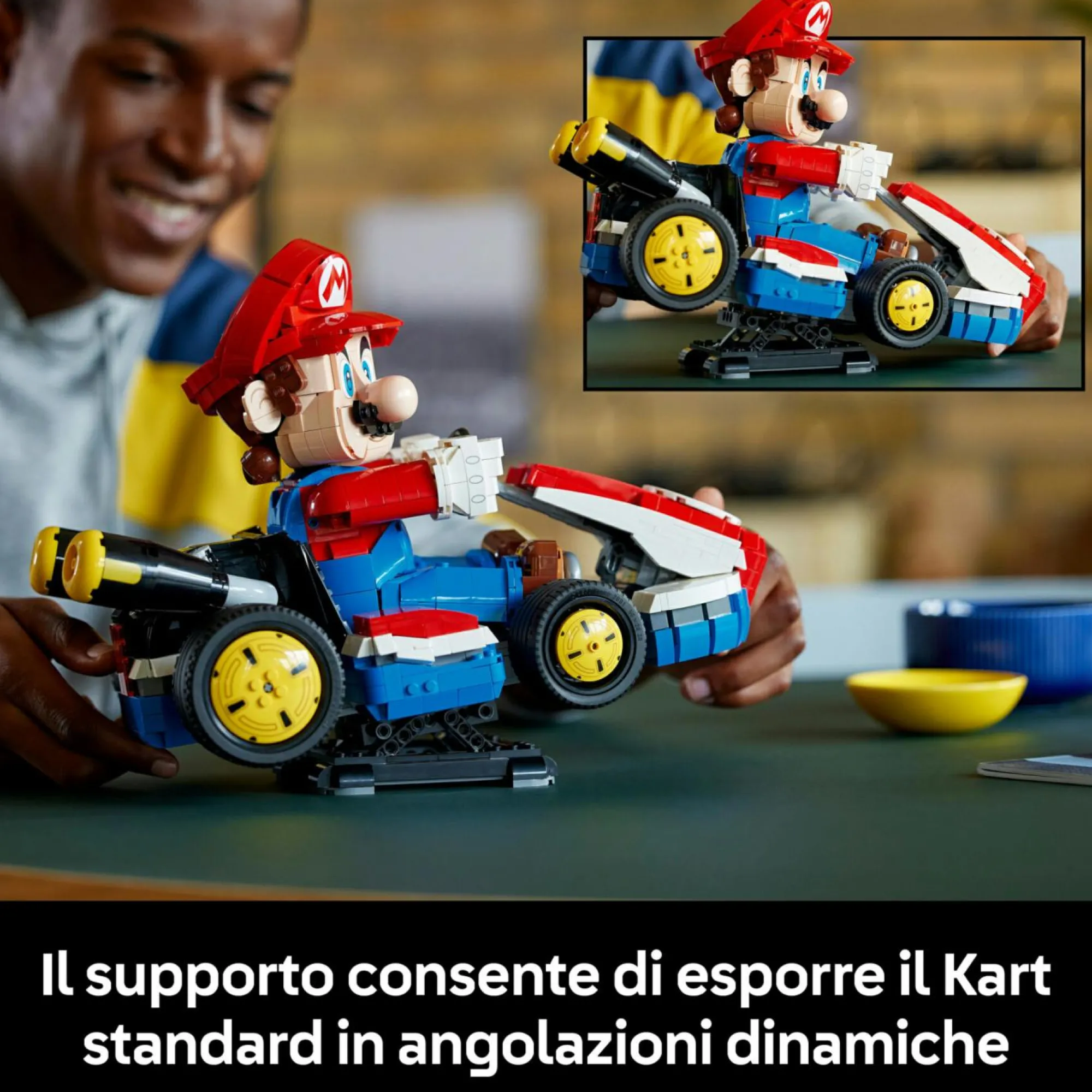 Progettato per un’esposizione dinamica: l’action figure di Super Mario è dotata di testa e braccia snodabili; il supporto consente di esporre il modello di auto in angolazioni dinamiche, come se stesse derapando o venisse guidato a tutta velocità