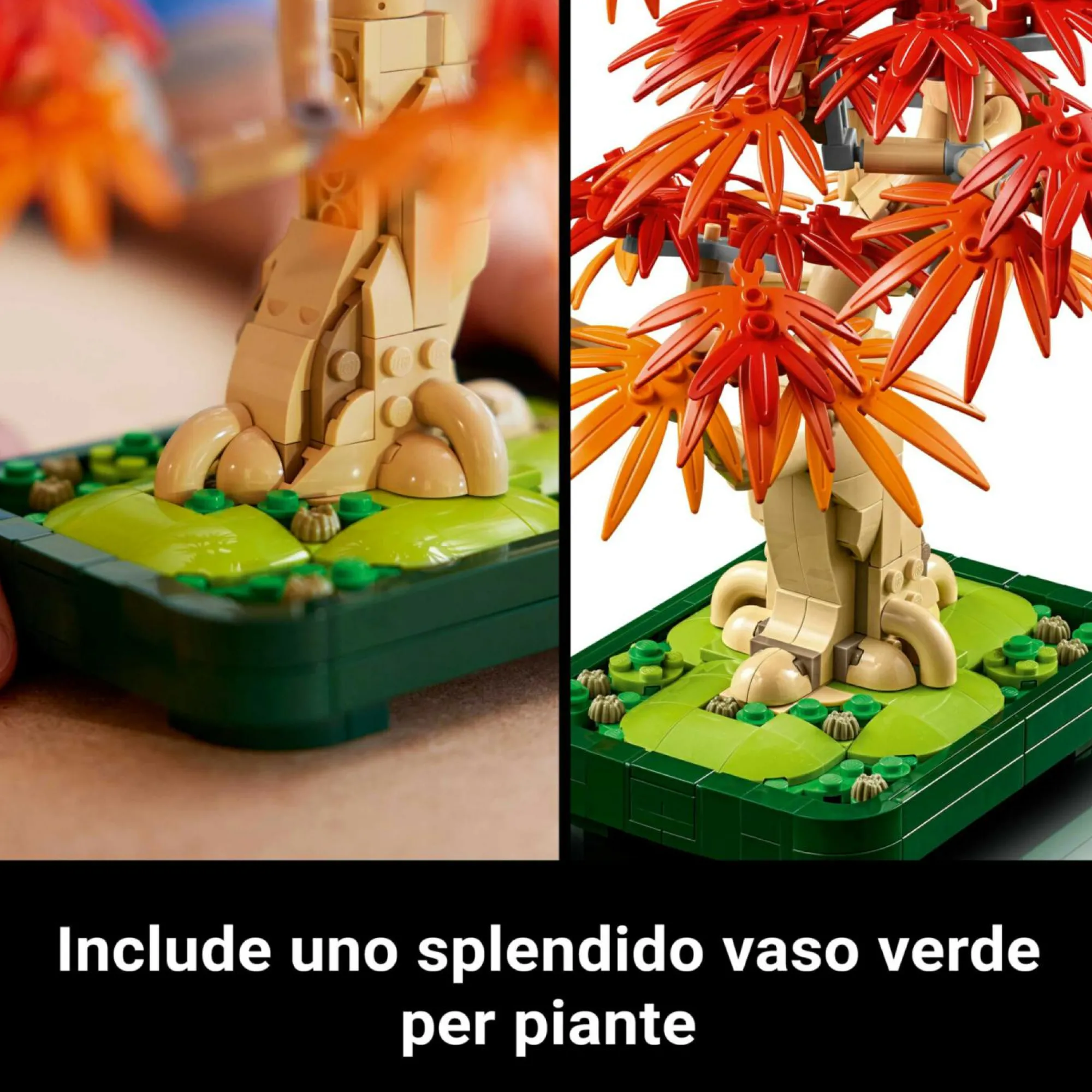 Pianta di plastica dai colori autunnali: cattura la vivacità della natura con questo albero LEGO, una pianta da interno finta, dotata di foglie rosse e ambrate, e posizionata in un vaso verde scuro per una facile esposizione