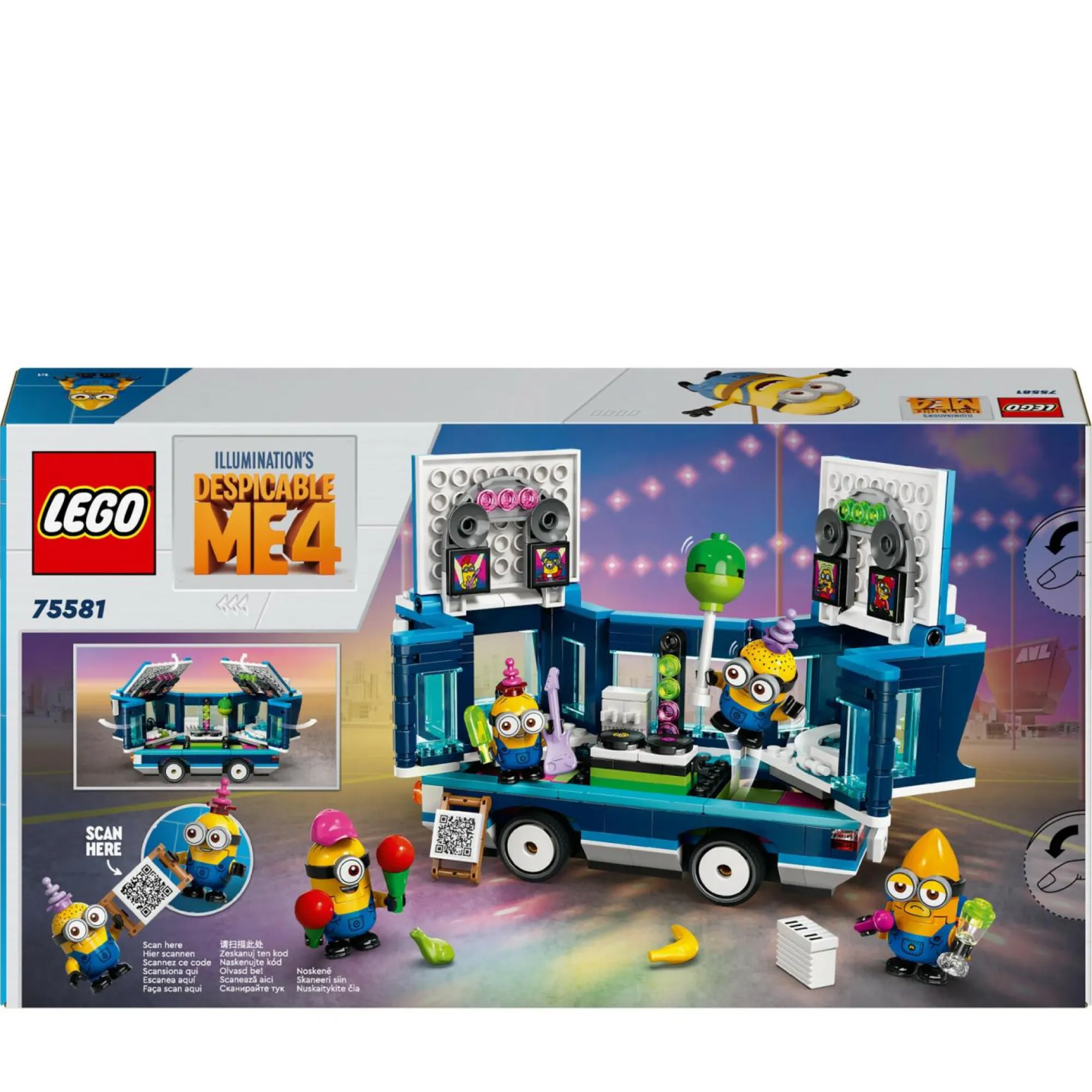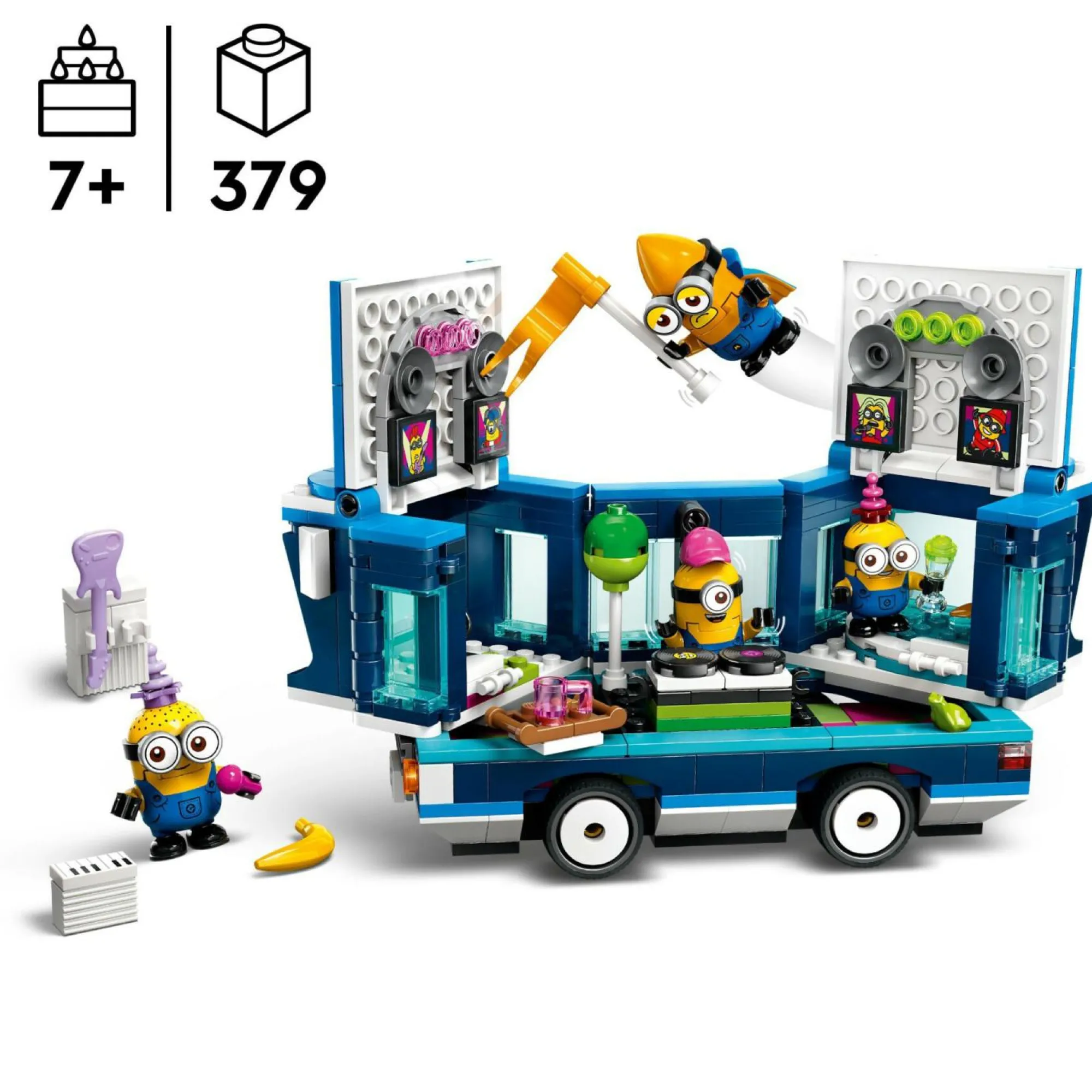 Veicolo giocattolo dei Minions: include un autobus LEGO che si trasforma in una ‘festa mobile’, con 4 simpatici personaggi LEGO Minions: Phil, Mel, Dave e il Mega Minions Gus che sorvola il bus