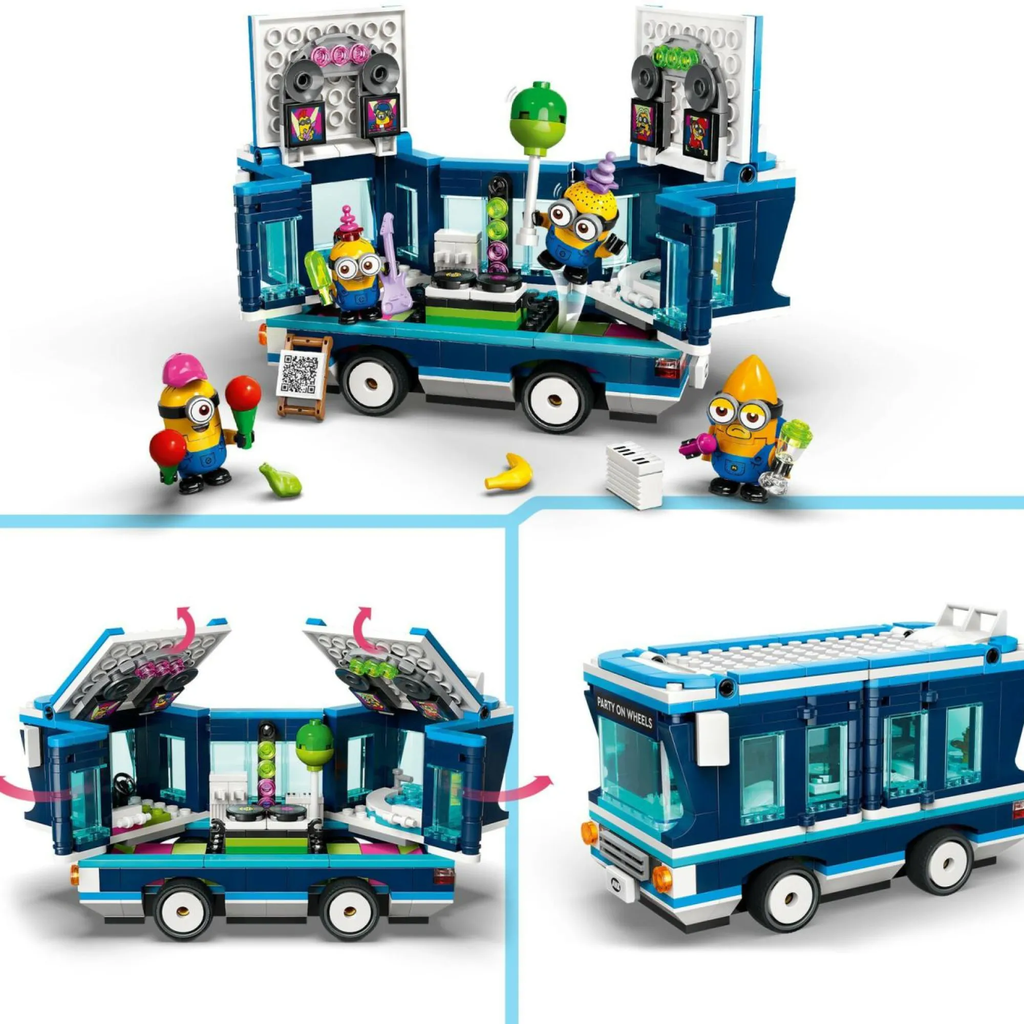 Gioco LEGO Minions versatile: l’autobus ha un sedile del conducente e una barra sul tetto (a cui Gus può aggrapparsi!) e si apre a metà su un lato per rivelare una postazione DJ, una pista da ballo e una vasca idromassaggio per le feste