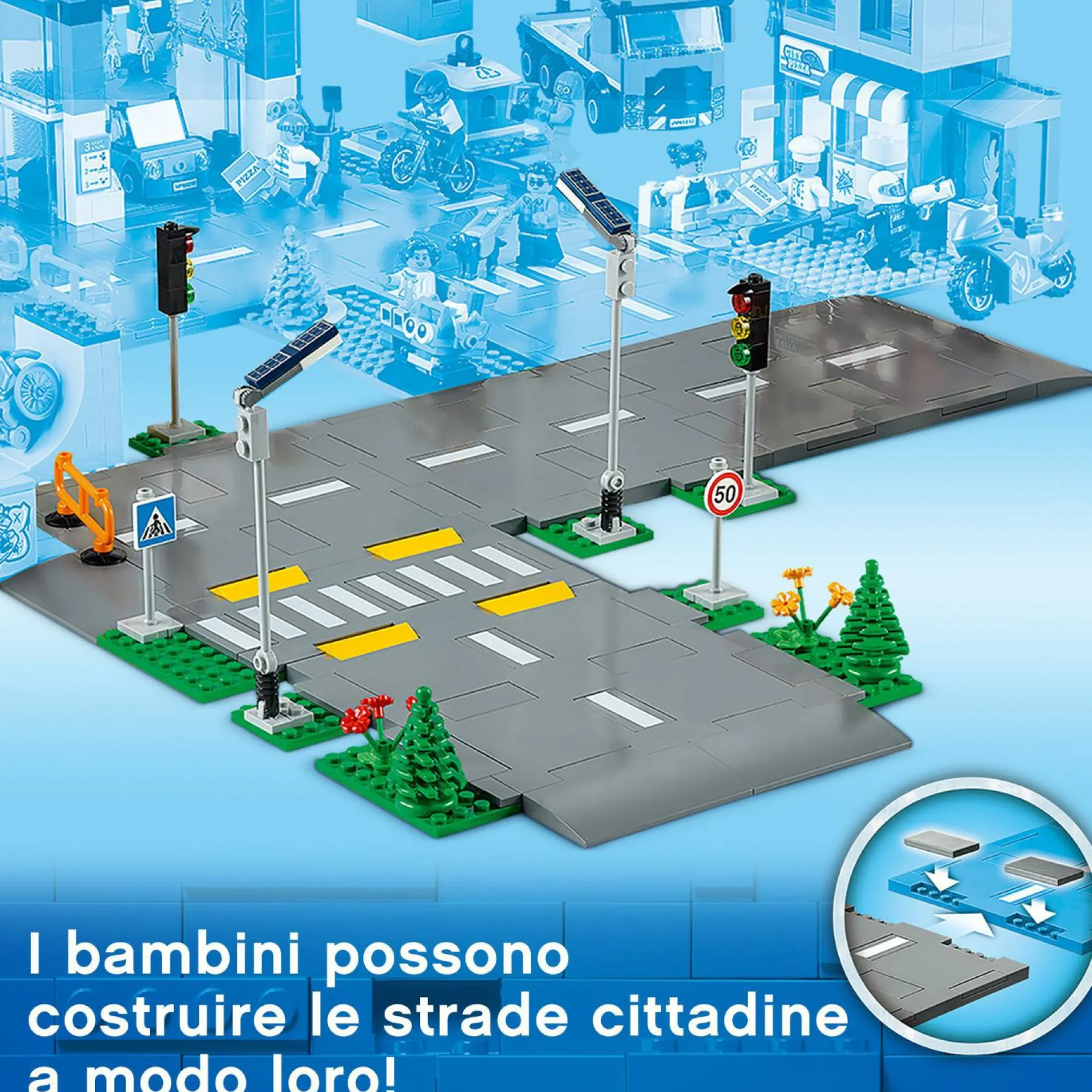 I piccoli costruttori possono espandere la propria città creando una grande rete stradale, e combinare le basi LEGO con gli altri set di costruzioni LEGO City