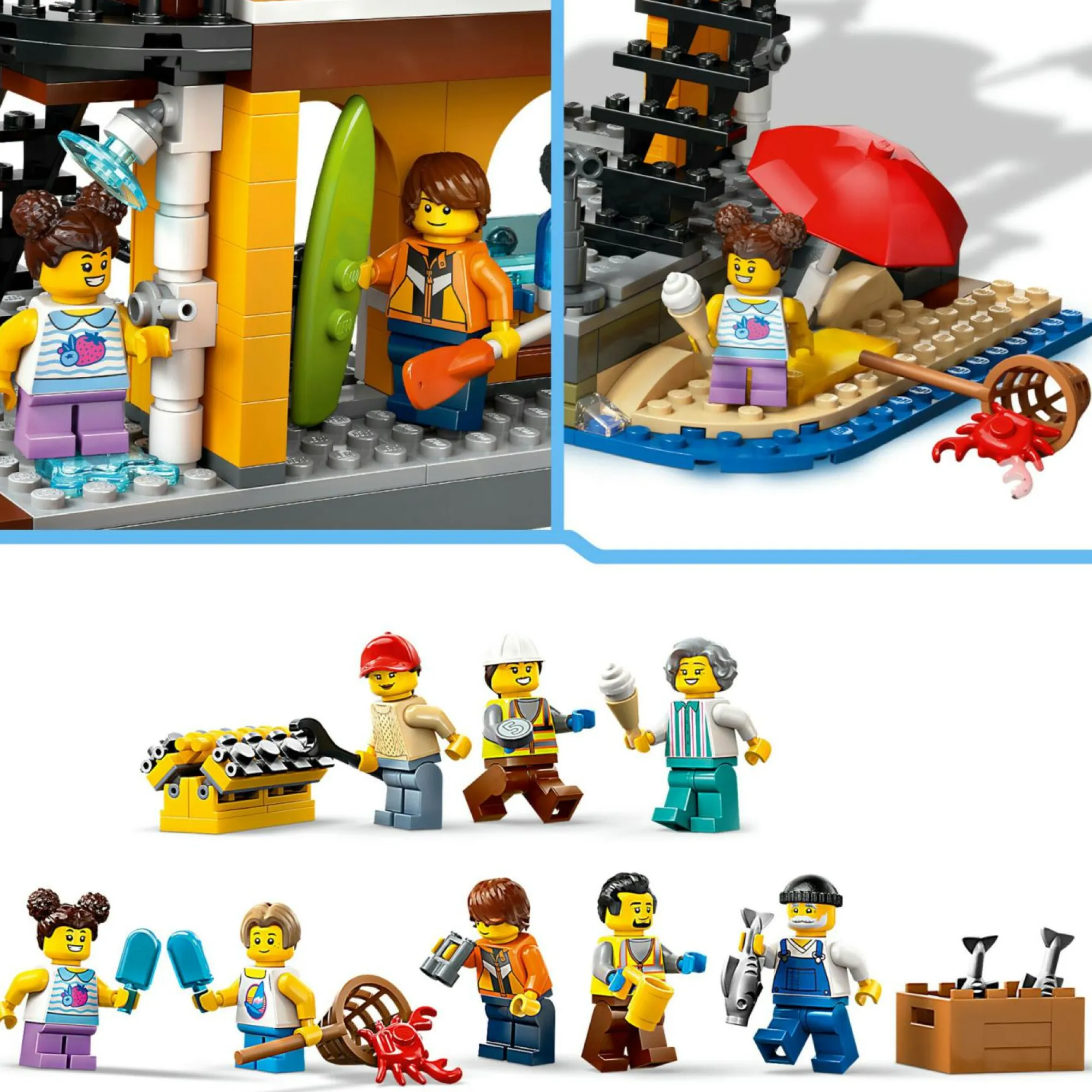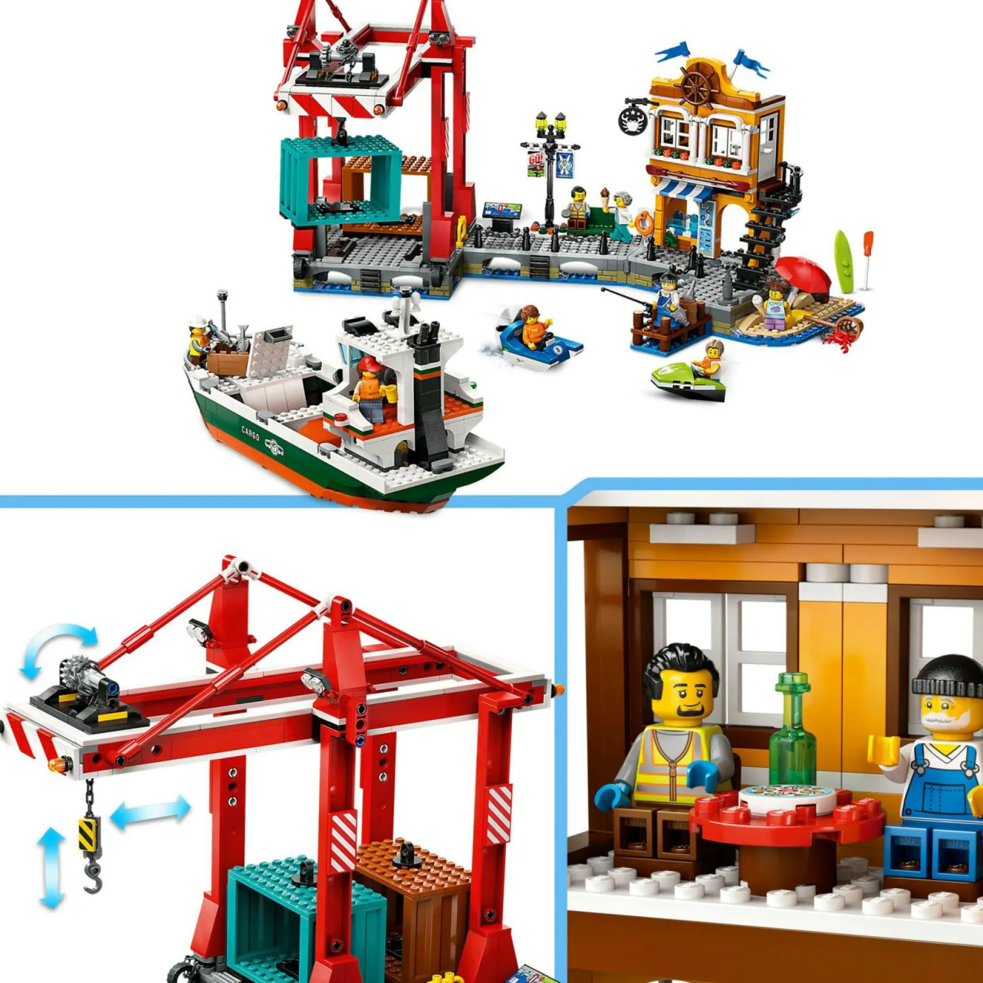Cosa include la scatola? Questo set di costruzioni per bambini comprende una barca giocattolo, 2 container, una gru LEGO per container funzionante, un porto con negozio e ristorante, una moto d’acqua, un pedalò e 8 minifigure LEGO City