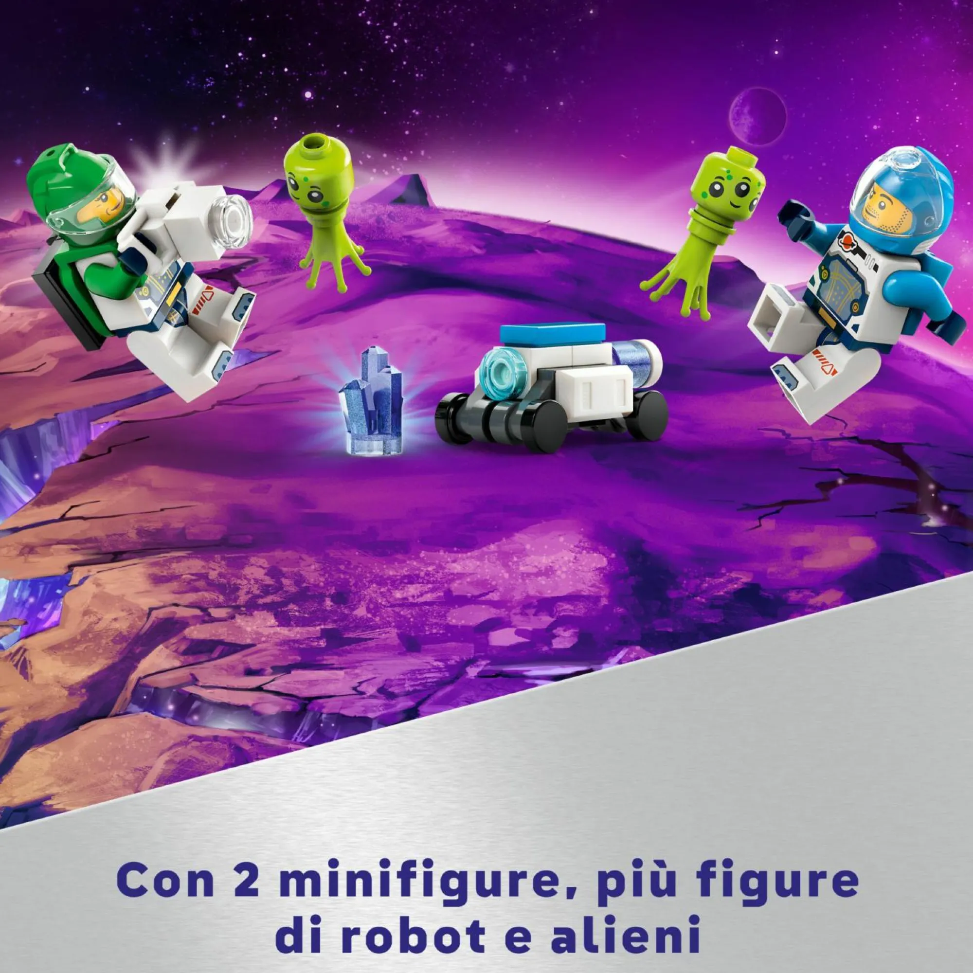 Tutto il necessario è nella scatola: include un rover per l’esplorazione spaziale, un’ambientazione con geyser, 2 minifigure di astronauti LEGO, un robot giocattolo da costruire e 2 action figure di alieni