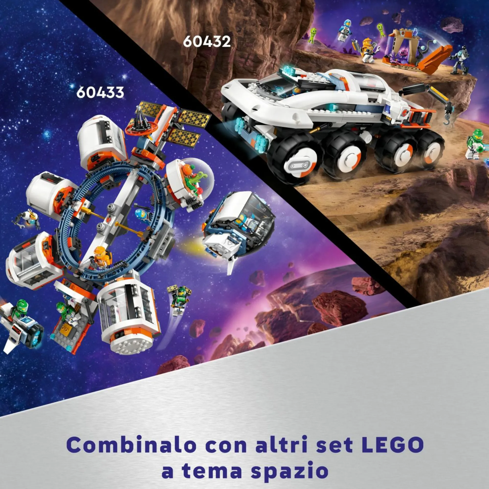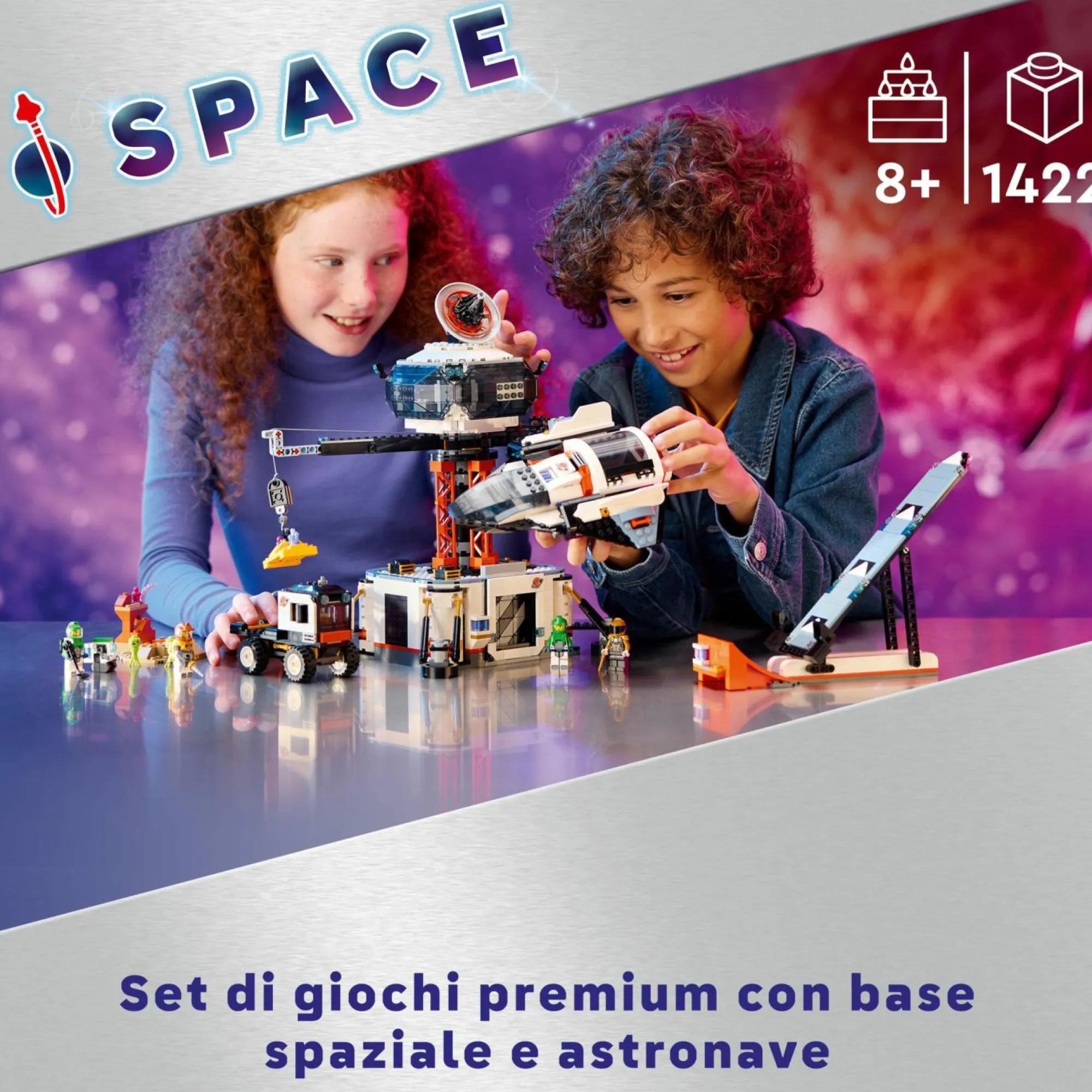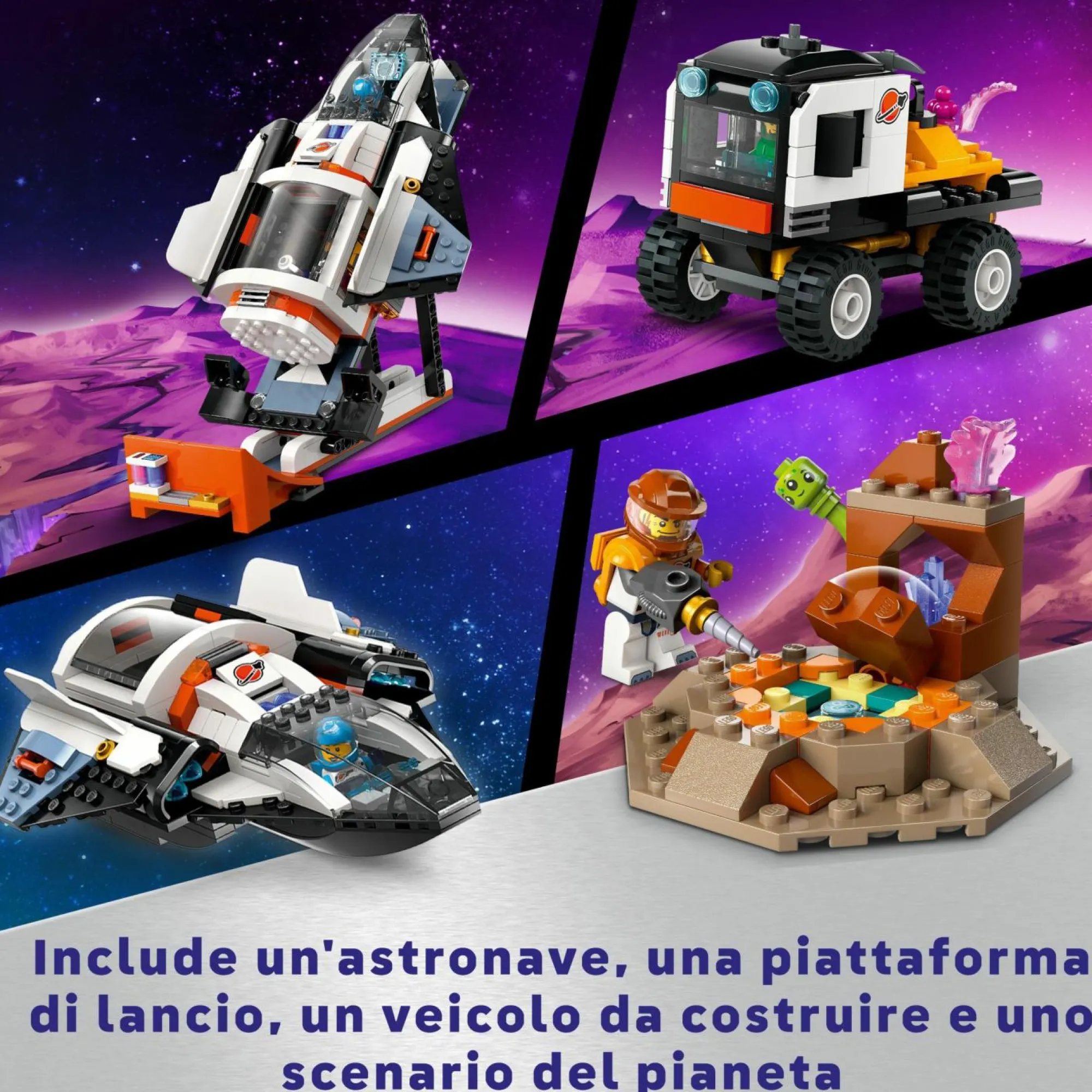 Cosa offre questo set? Una base spaziale con gru LEGO girevole, un’astronave giocattolo, una piattaforma di lancio, un veicolo rover, 6 minifigure di astronauti LEGO, un robot e 2 alieni