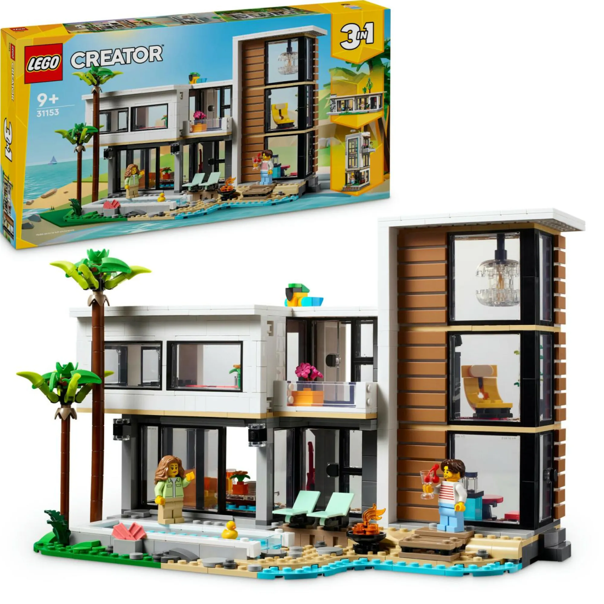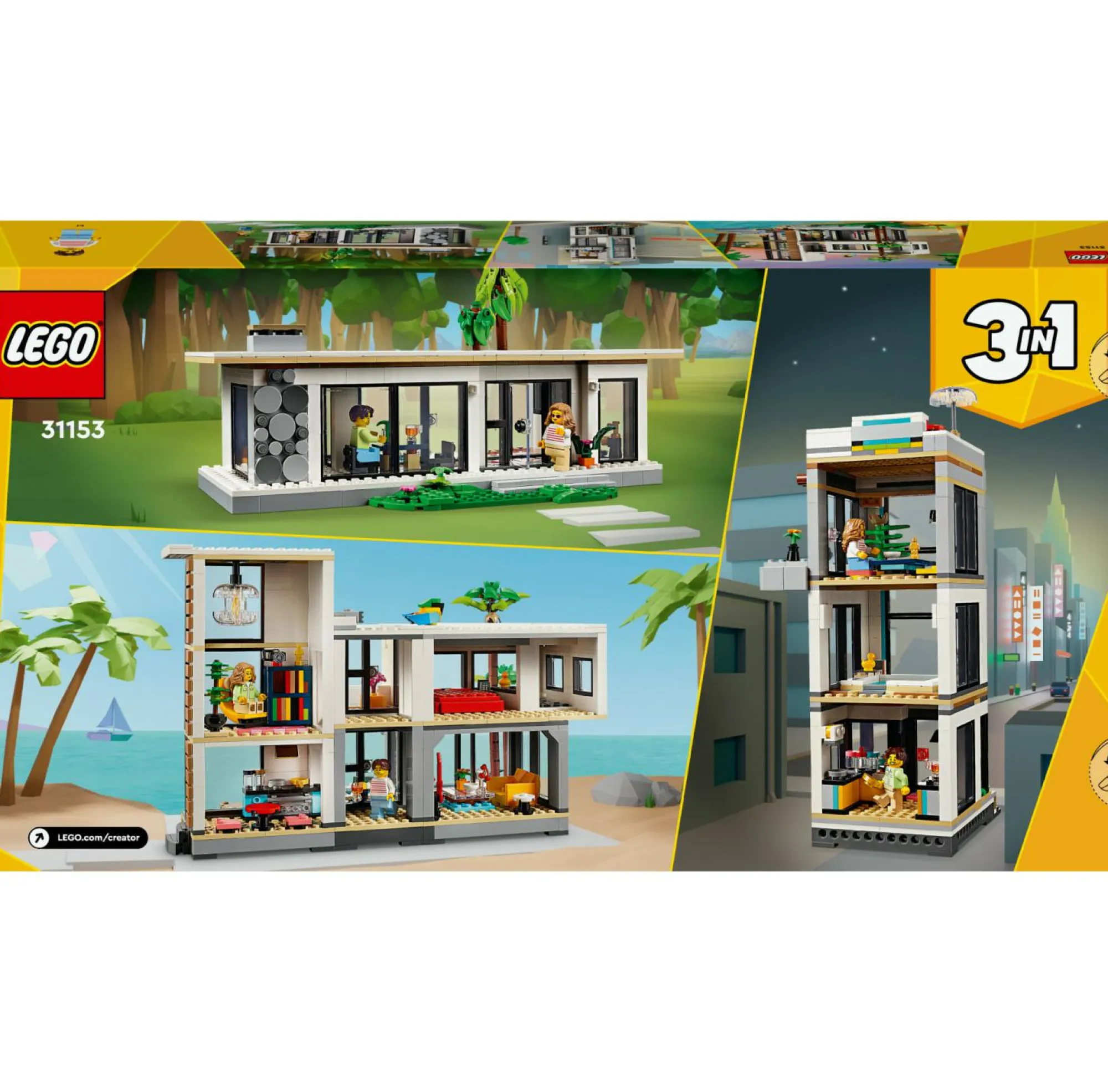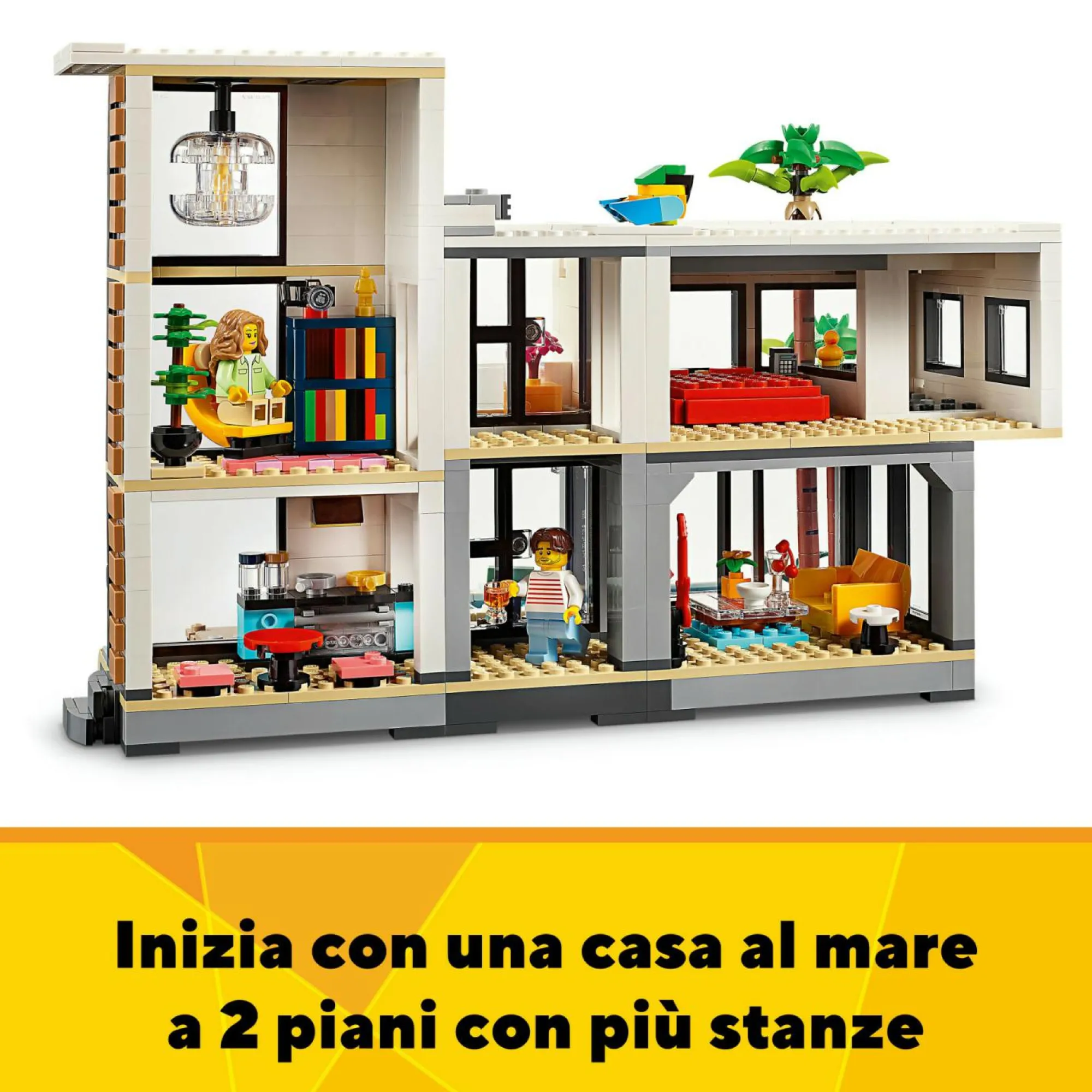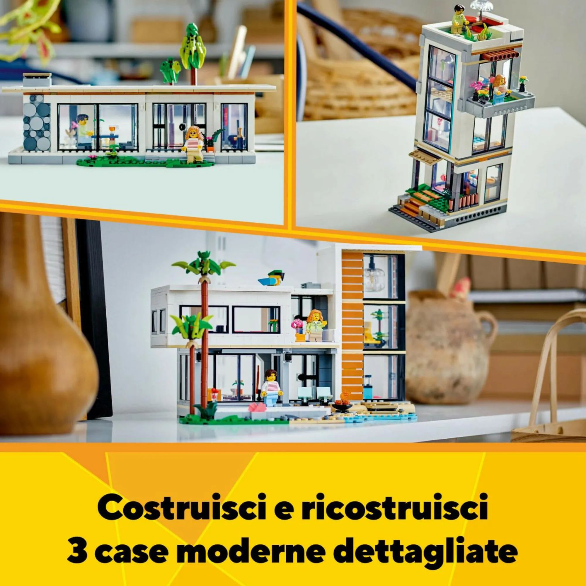 3 case giocattolo da costruire in 1: questo gioco per bambini e bambine da 9 anni in su, il set LEGO Creator 3 in 1 la Casa Moderna, permette di costruire e ricostruire 3 diversi modellini di case ricche di dettagli, utilizzando gli stessi mattoncini
