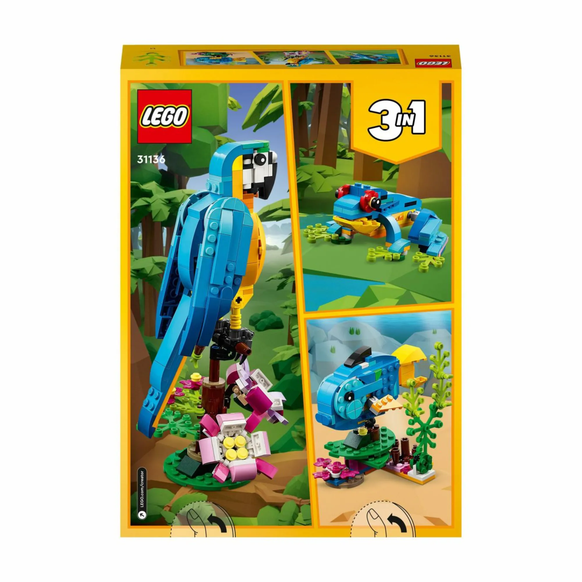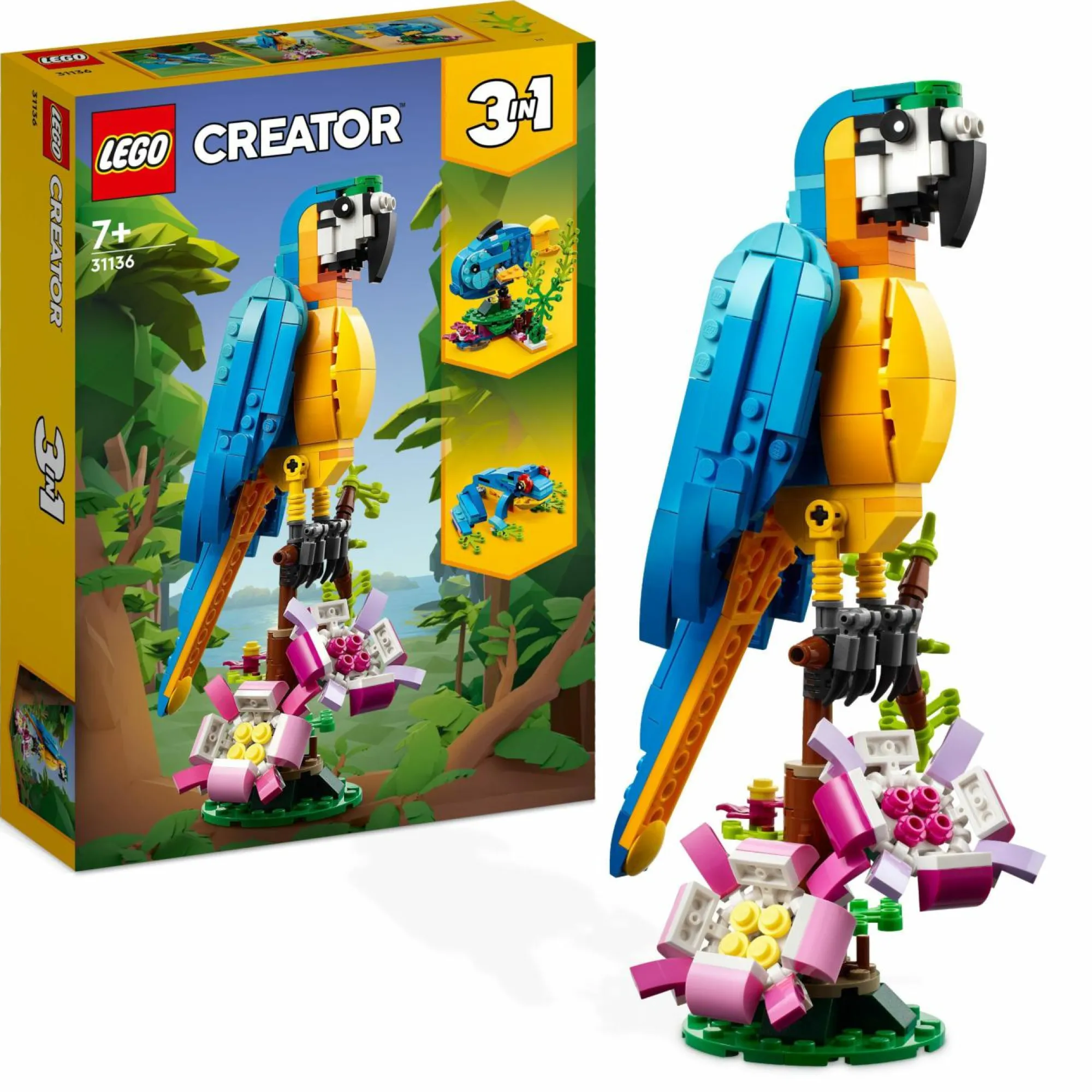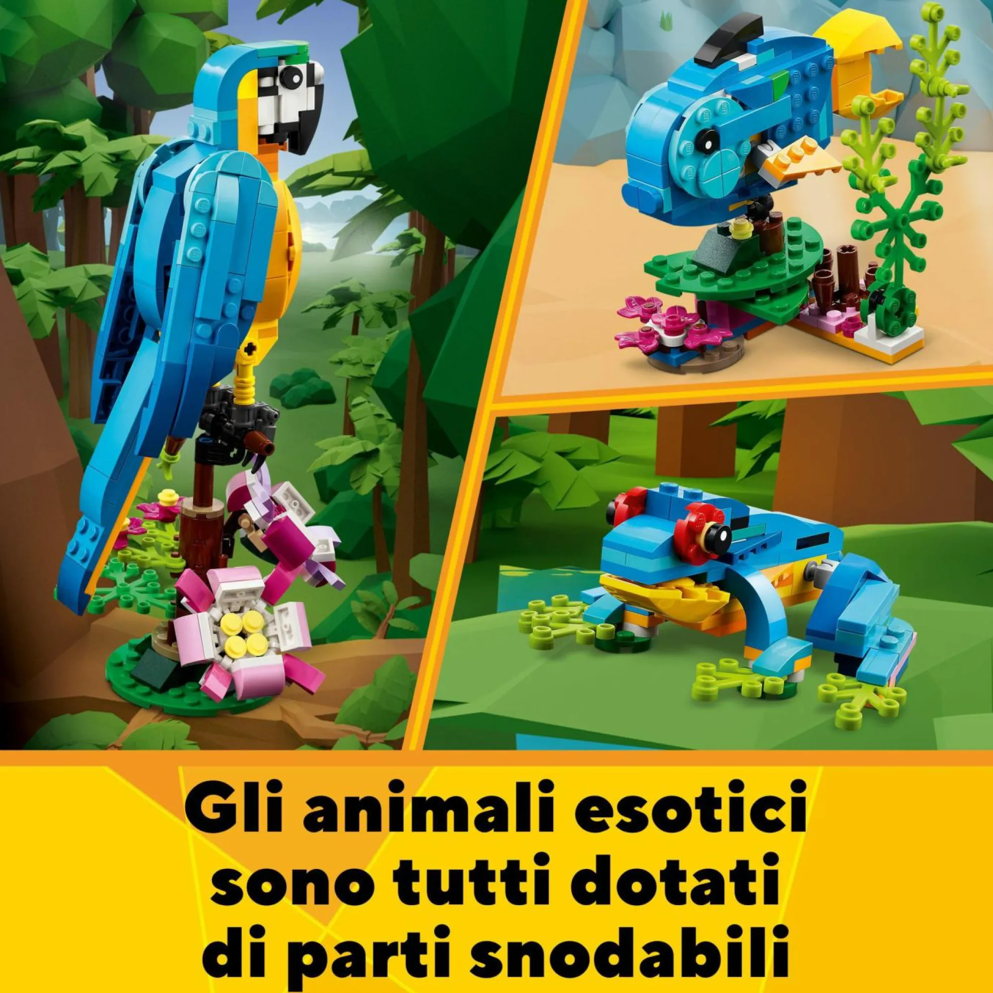 Questo set LEGO Creator 3 in 1 contiene 3 animali della giungla da costruire: un pappagallo appollaiato su un ramo, una rana giocattolo e un pesce giocoso