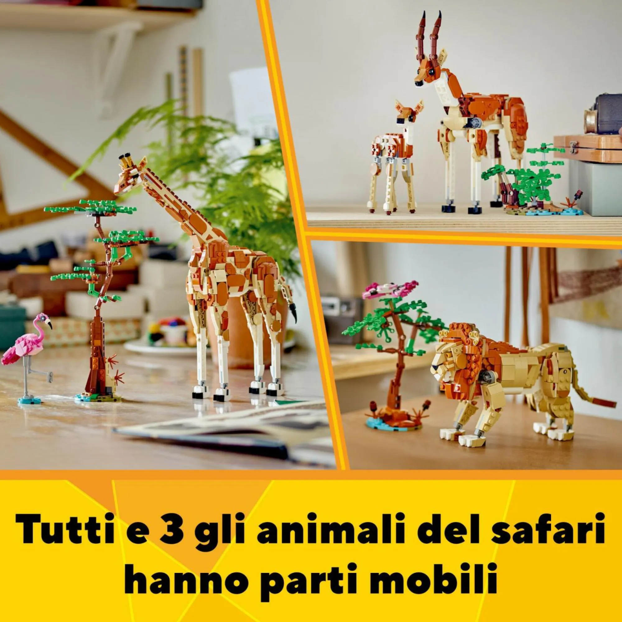 Animali giocattolo snodabili: la giraffa giocattolo può muovere le gambe, il lungo collo, la coda e le orecchie; le 2 gazzelle le gambe, il collo e le orecchie; il leone LEGO le gambe, la coda e le zampe