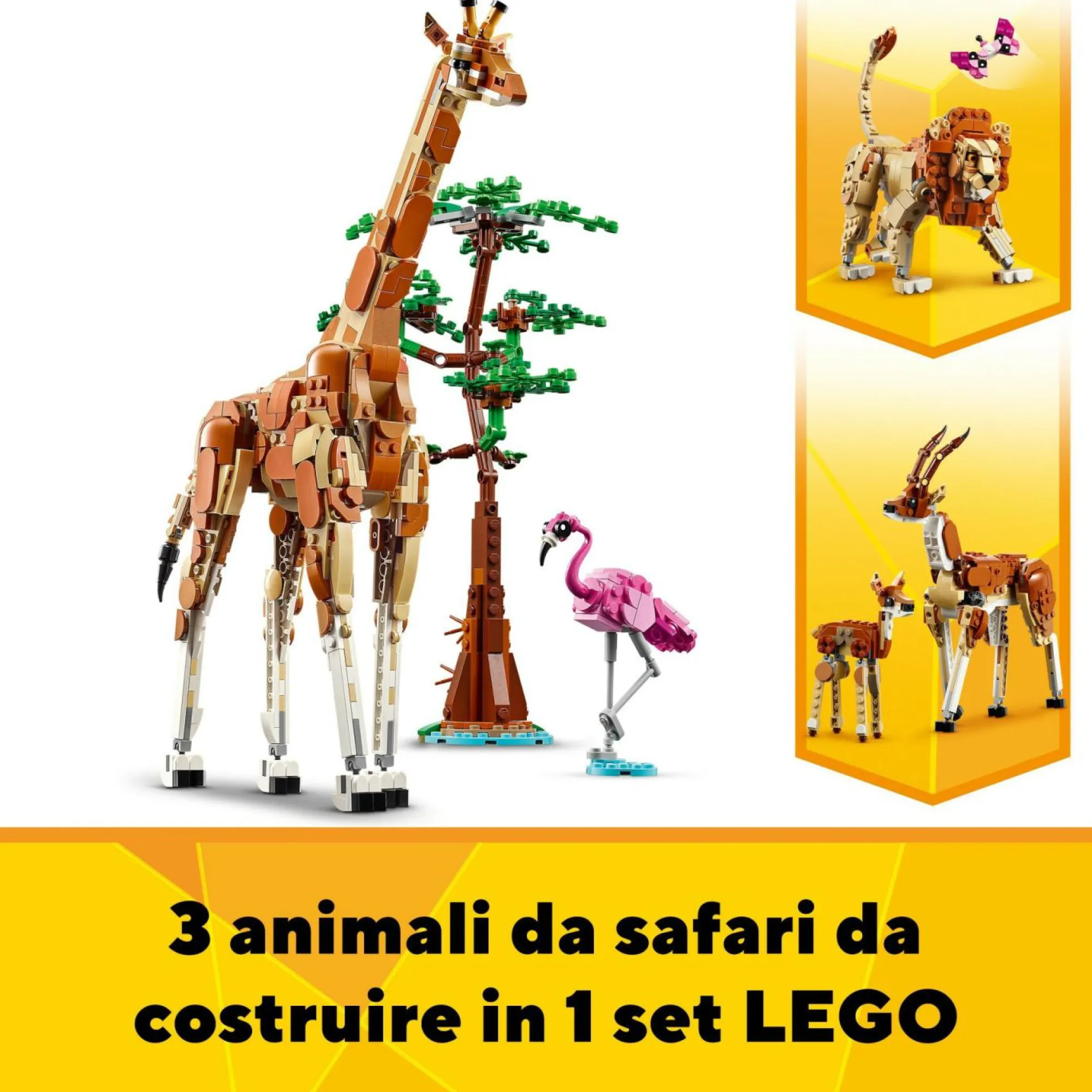 Set con animali giocattolo da safari con tante opzioni di gioco: i piccoli possono dar vita a storie emozionanti con una giraffa LEGO e un fenicottero rosa, 2 gazzelle, oppure un leone giocattolo e una farfalla
