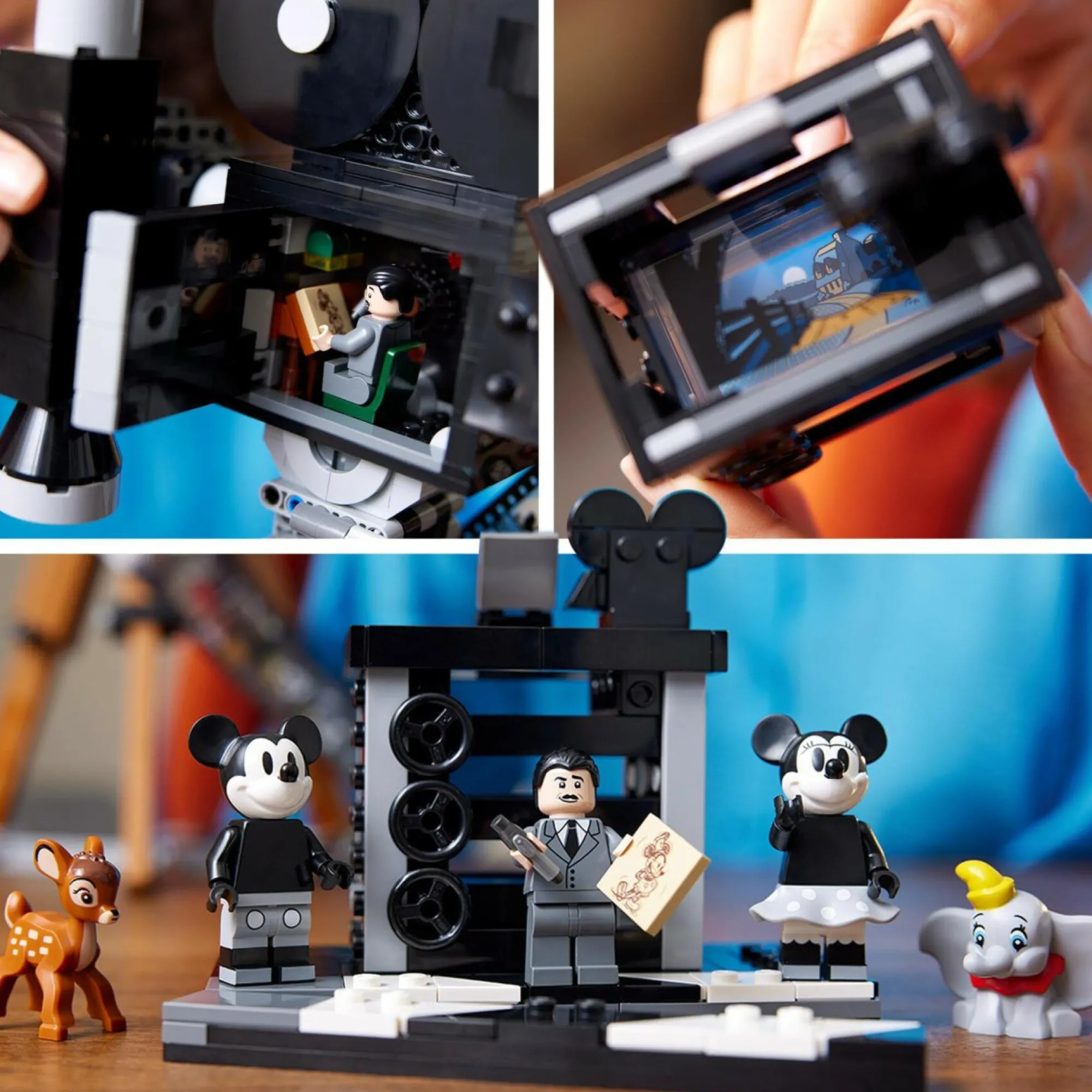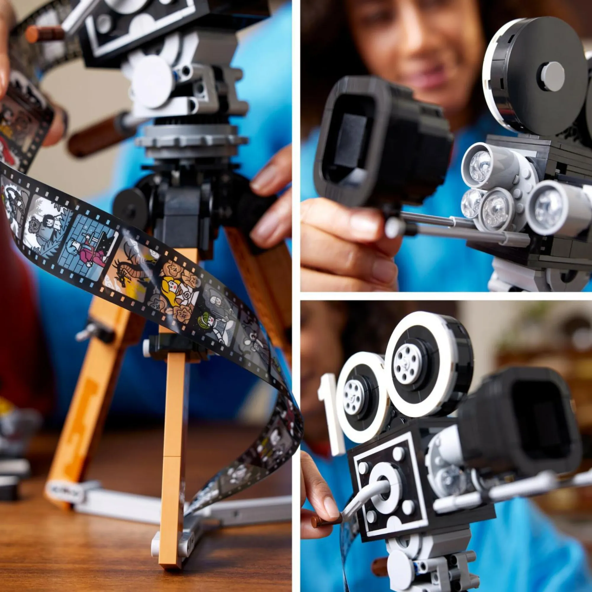 Questo set ricco di cimeli composto da 811 pezzi, permette di costruire una cinepresa vintage con pannello posteriore apribile con sorpresa, e una striscia di pellicola che mostra fotogrammi di 20 storici film Disney