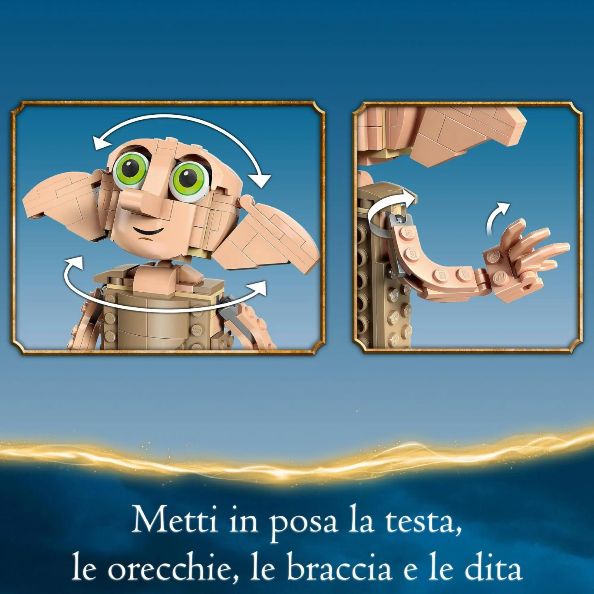 Il personaggio di Dobby l’elfo domestico ha testa, orecchie e braccia snodabili, per creare diverse pose; inoltre, potrai regolare le dita per fargli tenere gli accessori costruiti con i mattoncini