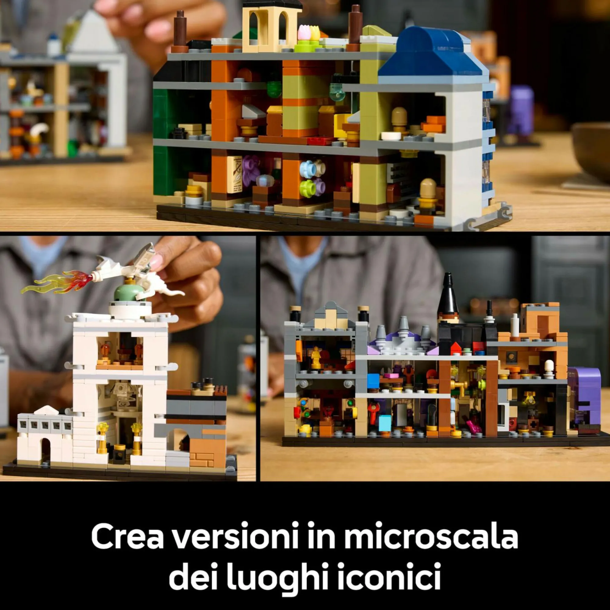 16 modelli di mini-negozi Diagon Alley: crea versioni in microscala delle iconiche ambientazioni, come l’Emporio del Gufo di Eeylops, la Banca dei maghi Gringott, il Paiolo magico e il quartier generale della Gazzetta del Profeta, oltre a Nottetempo