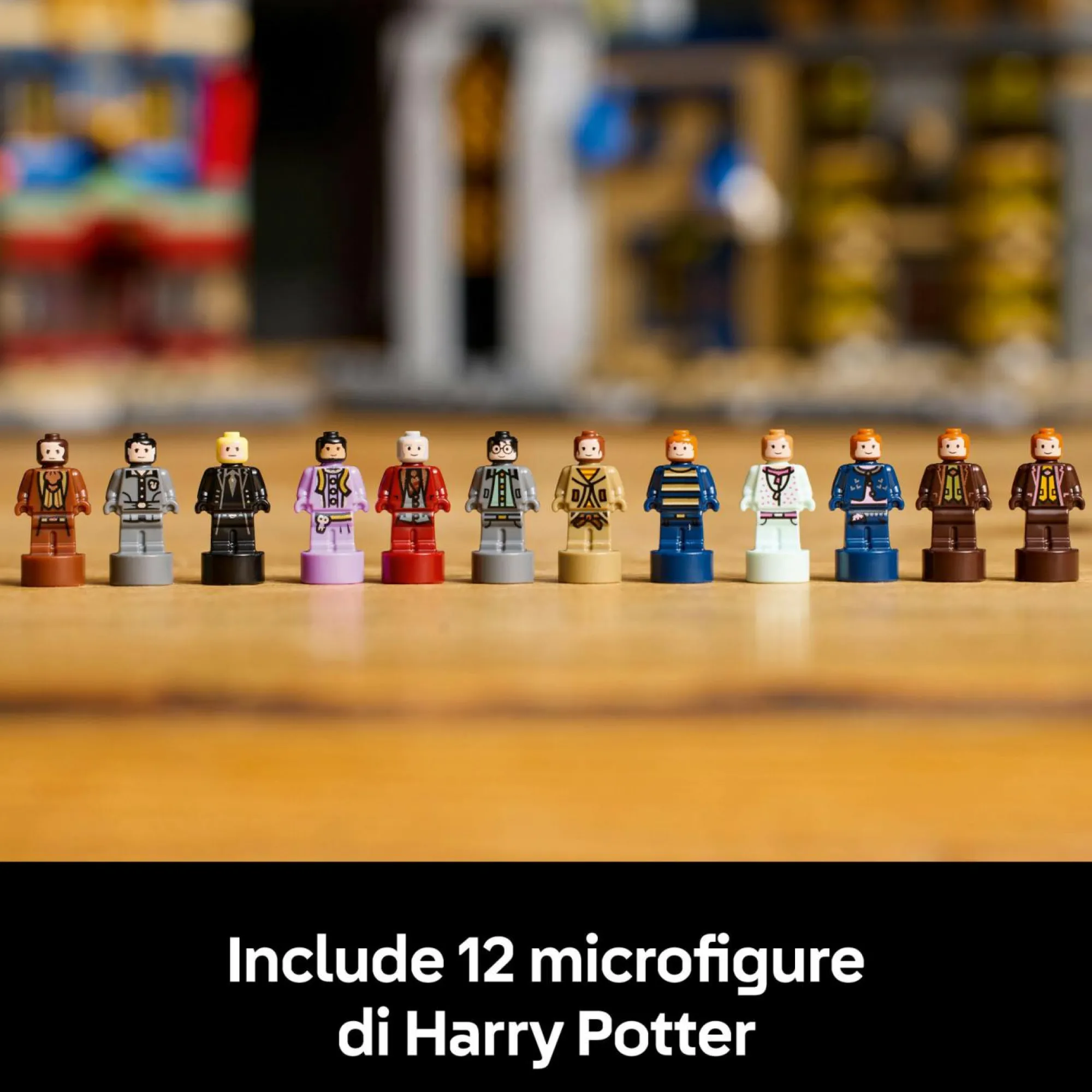 12 microfigure rare di personaggi LEGO Harry Potter: Harry Potter, Ron Weasley, Hermione Granger, Fred Weasley, George Weasley, Lavanda Brown, Ginny Weasley, Draco Malfoy, Narcissa Malfoy, Signor Borgin e altri