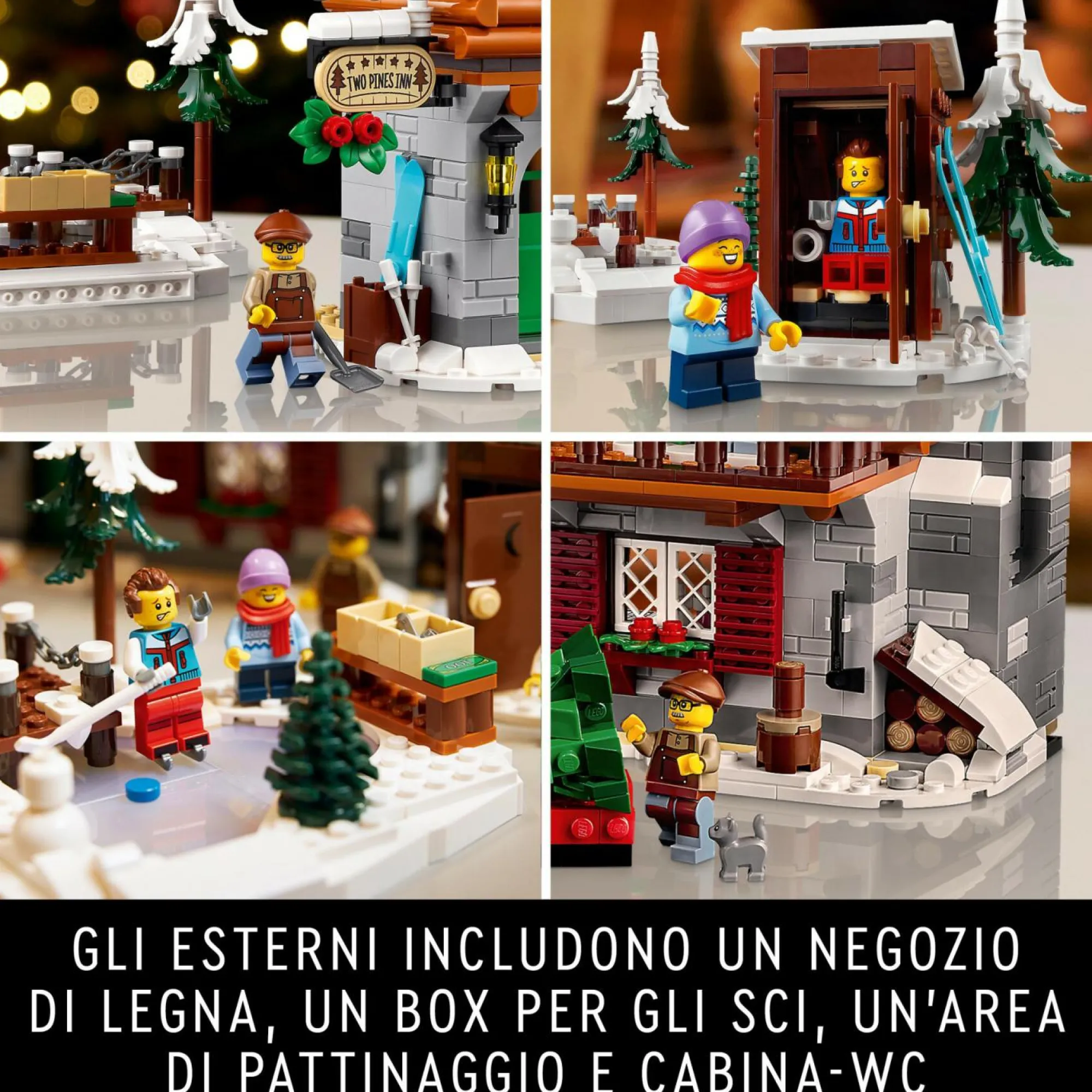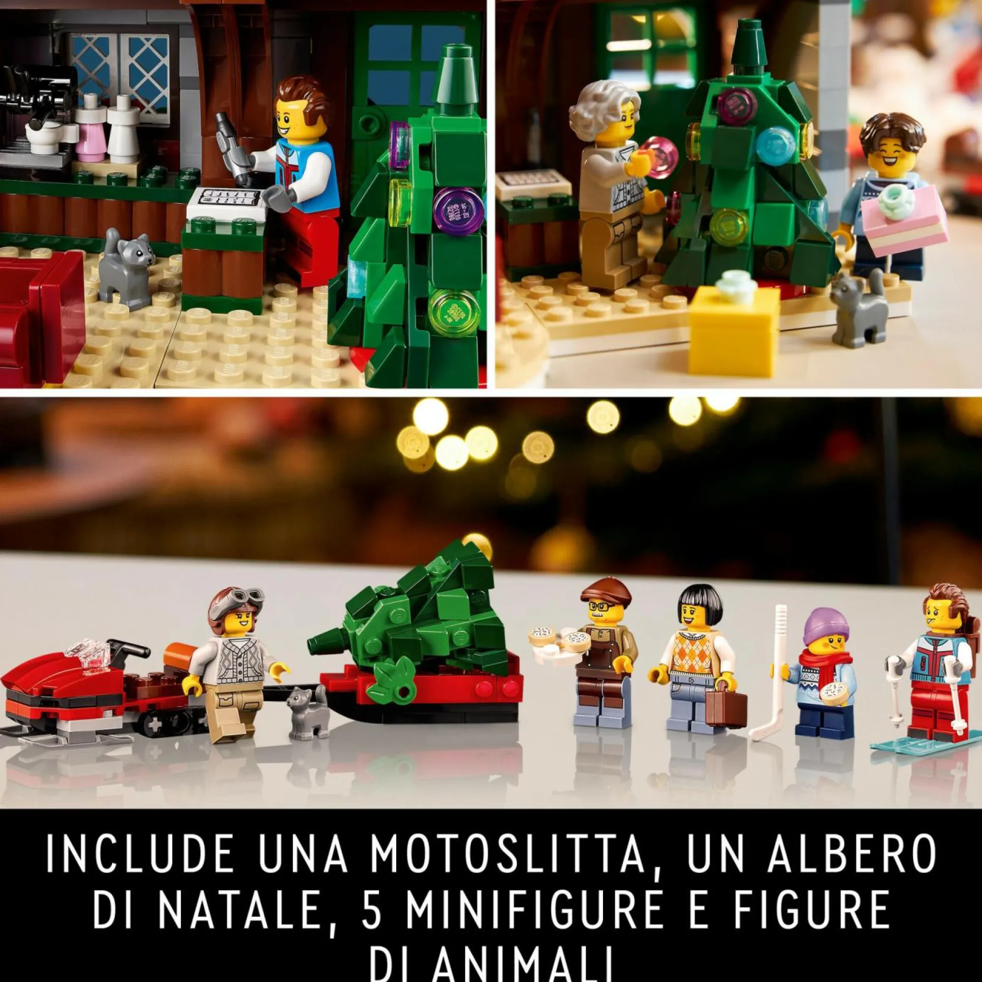 Cosa include? La casa LEGO a 3 piani include un’area pattinaggio, una cabina WC, una motoslitta, un albero di Natale, decorazioni invernali per l’albero, un libro degli ospiti, 5 minifigure, gatti, scoiattoli e uccelli