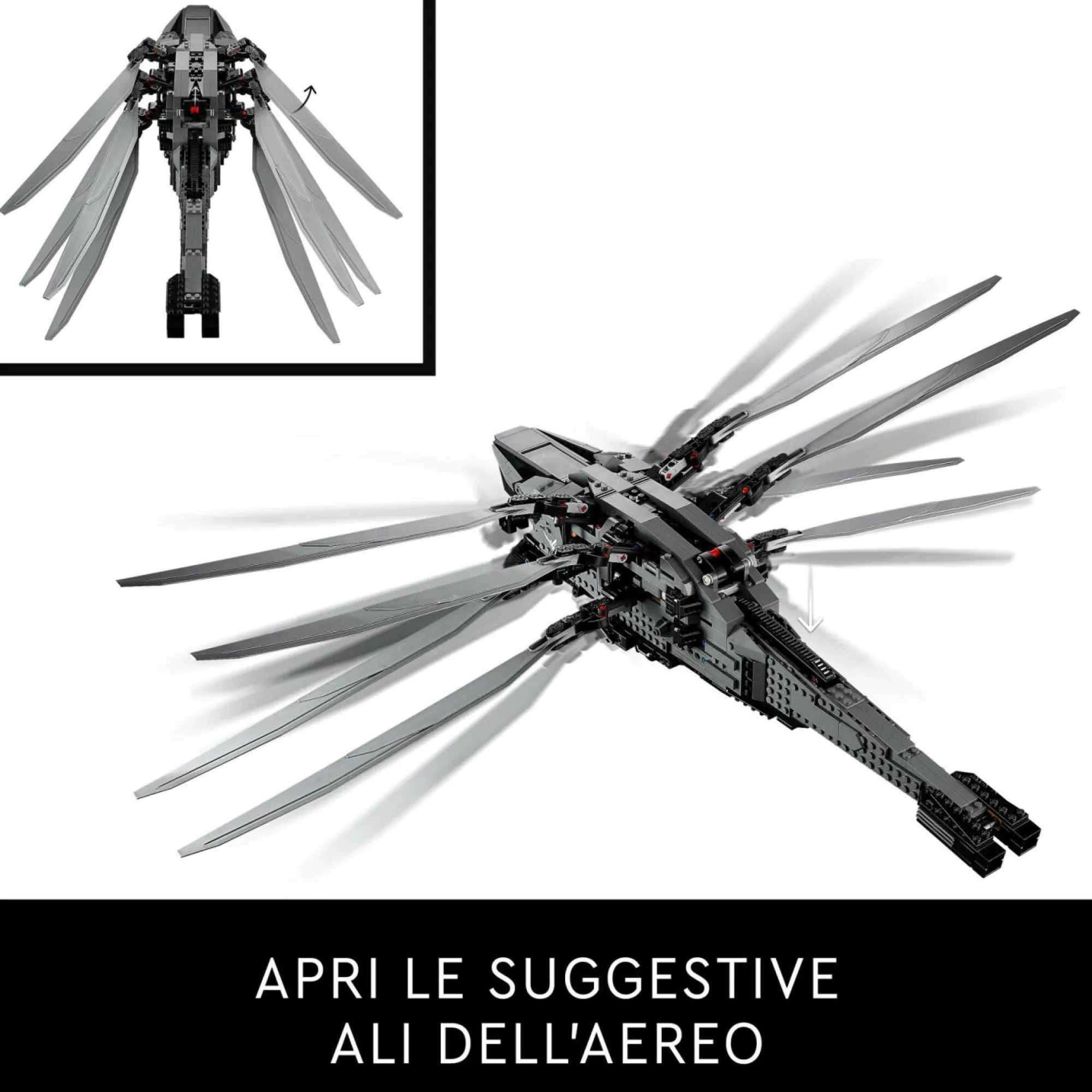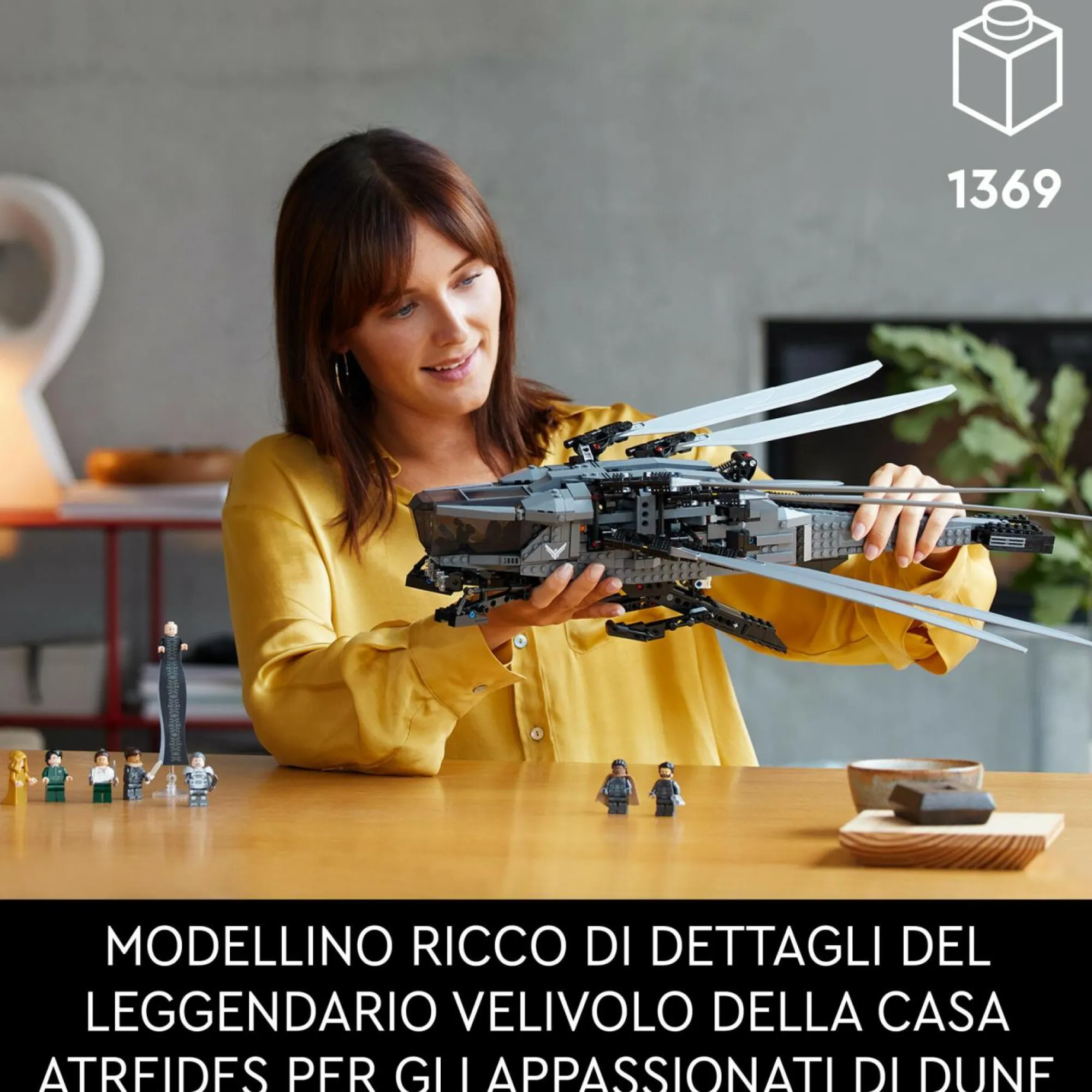 Cosa c’è nella scatola? Il kit di modellismo da costruire per adulti include il necessario per realizzare la replica LEGO del veicolo Dune Atreides Orinitottero Reale, con ali apribili funzionanti e carrello di atterraggio retrattile