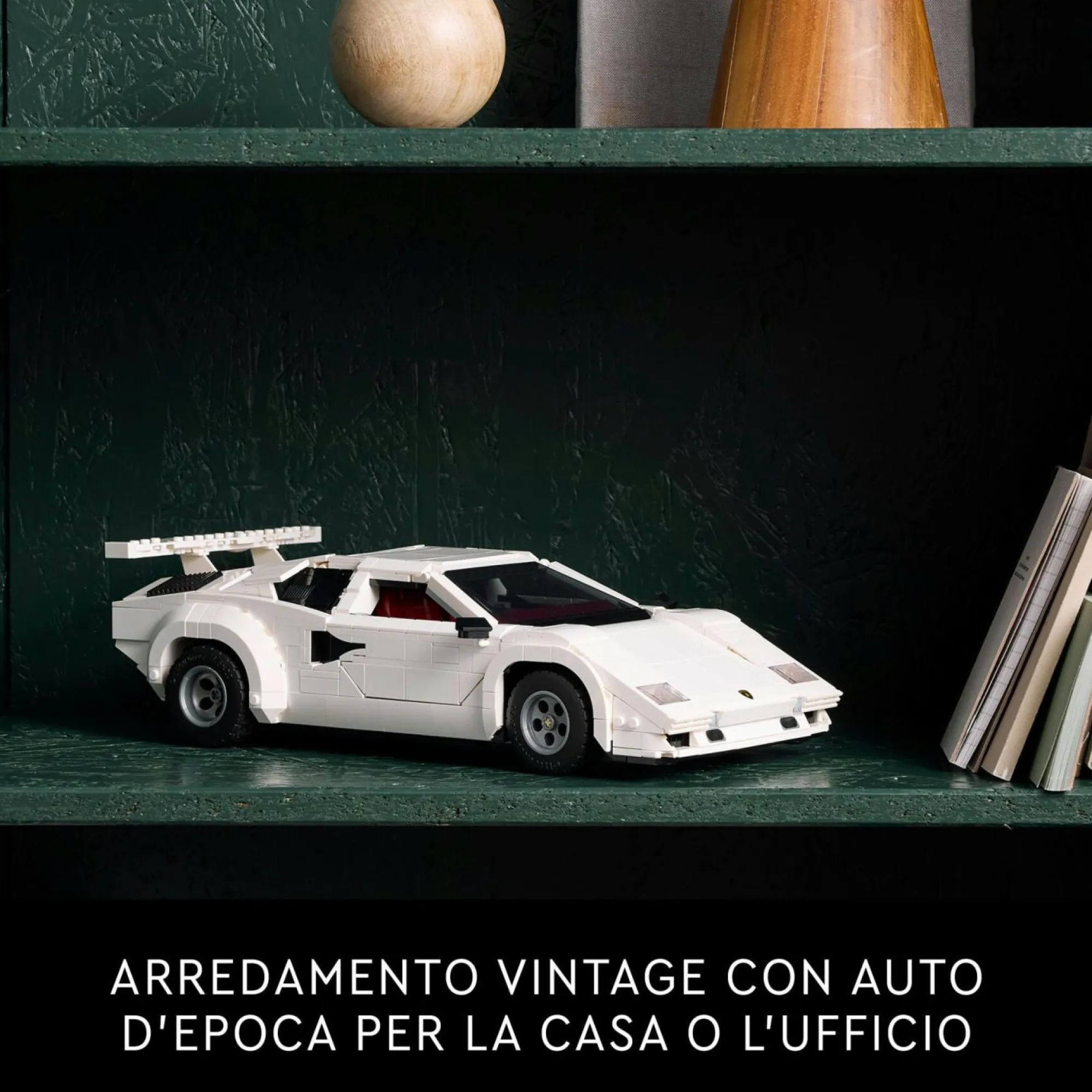 Cosa c’è nella scatola? Il set comprende un veicolo LEGO da collezione, una versione in scala e ben dettagliata della Lamborghini Countach 5000 Quattrovalvole