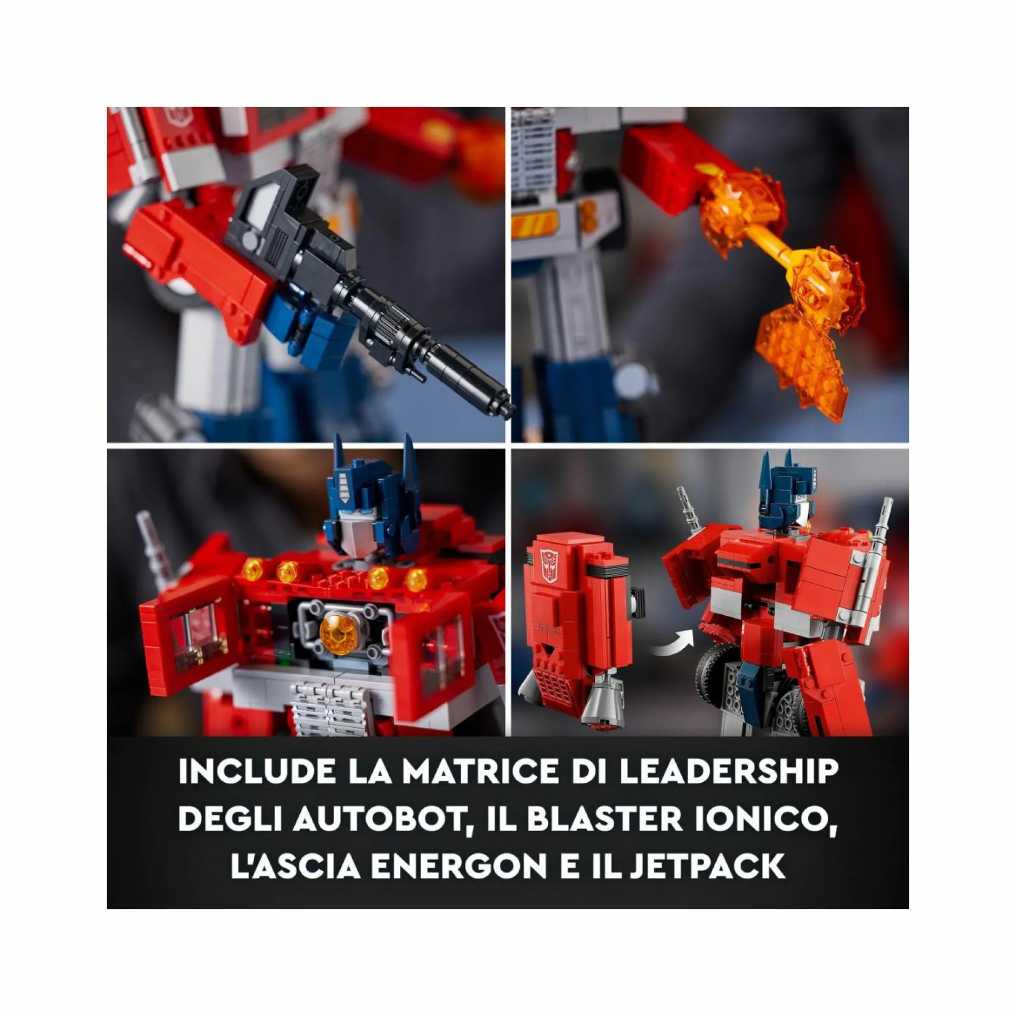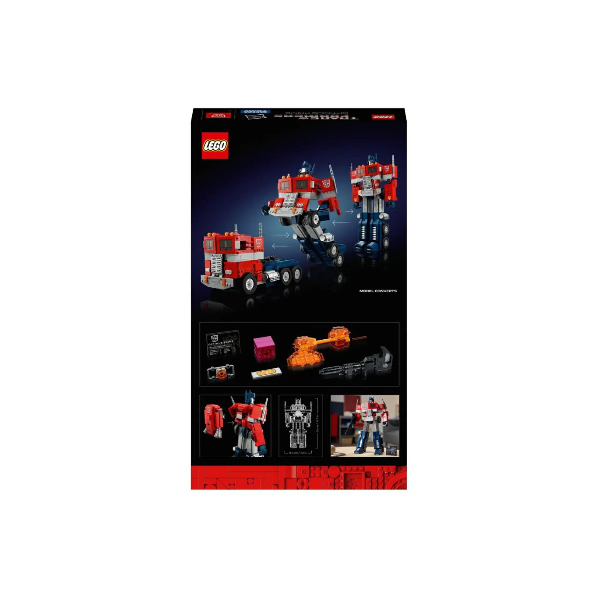 Un set LEGO per adulti con cui realizzare Optimus Prime, il leggendario Transformers Leader degli Autobot: un dettagliato modellino da costruire 2 in 1 che si trasforma da robot a camion e viceversa