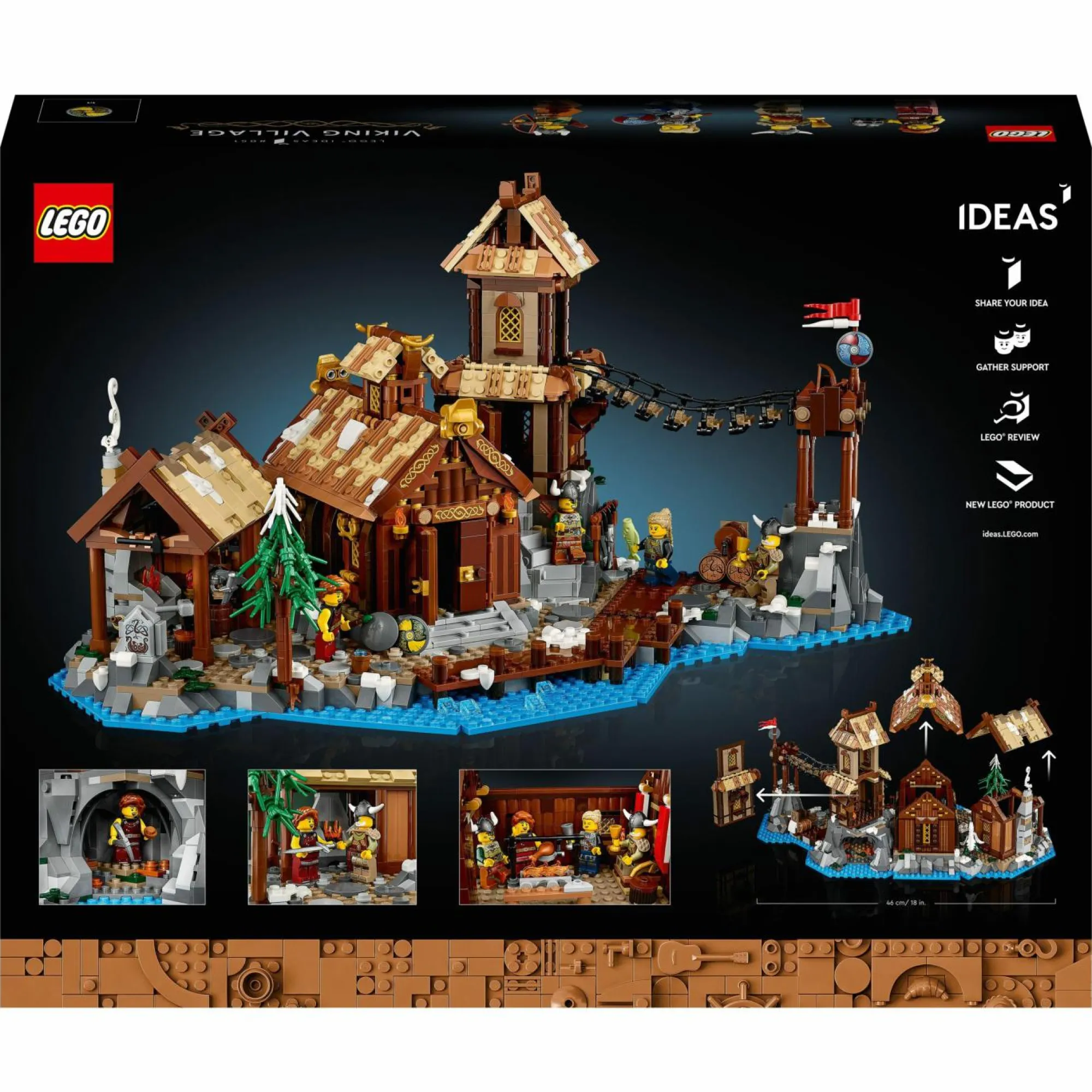 La fucina del fabbro e il modellino di casa hanno tetti rimovibili, mentre la torre di guardia ha una parete staccabile, per ammirare gli interni ricchi di dettagli e di riferimenti ai classici set LEGO dei Vichinghi