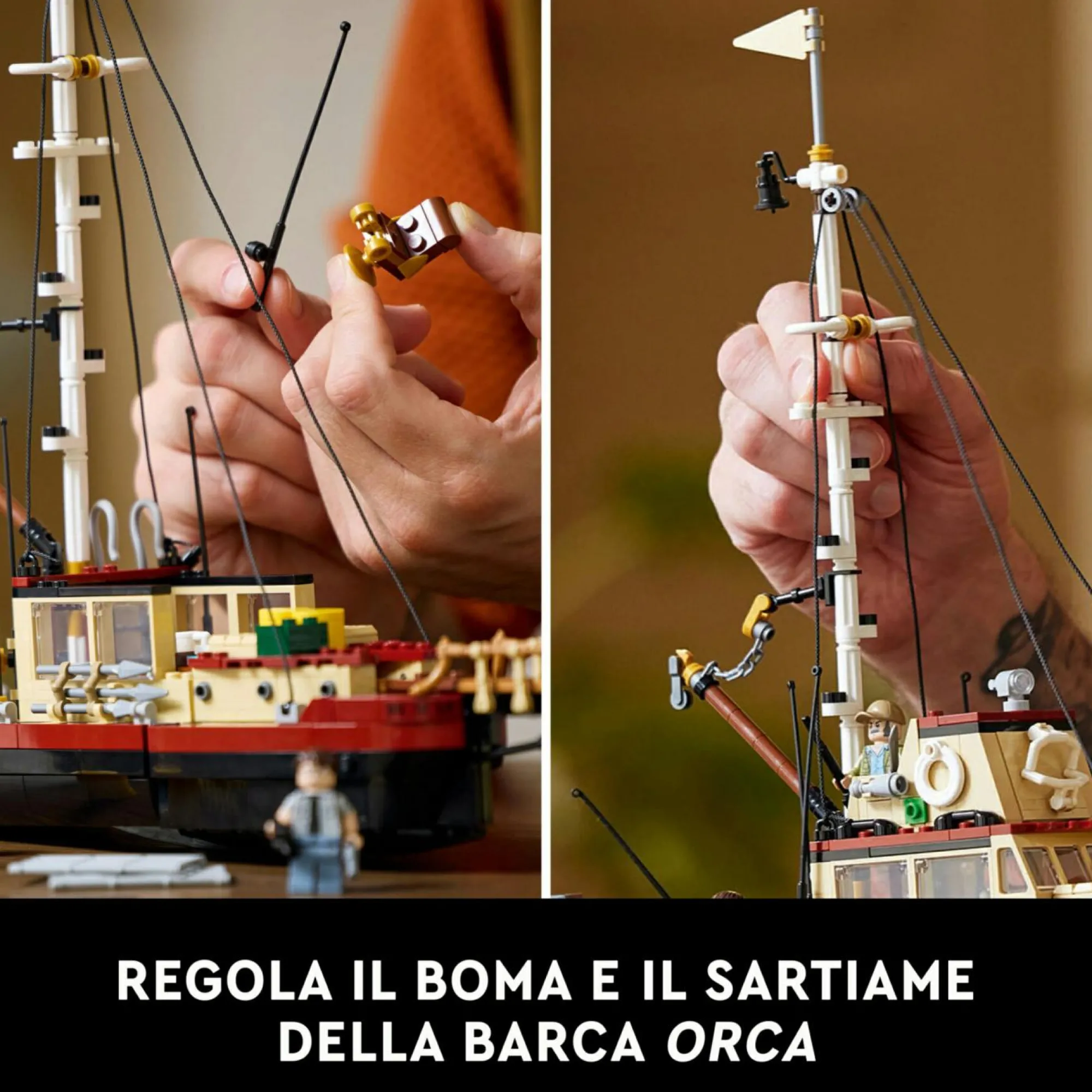 Barca LEGO e base con mare in mattoncini: il modellino da costruire della barca Orca è dotato di cabina con tetto rimovibile per una facile accesso agli interni, di boma e sartiame regolabili, e di accessori iconici