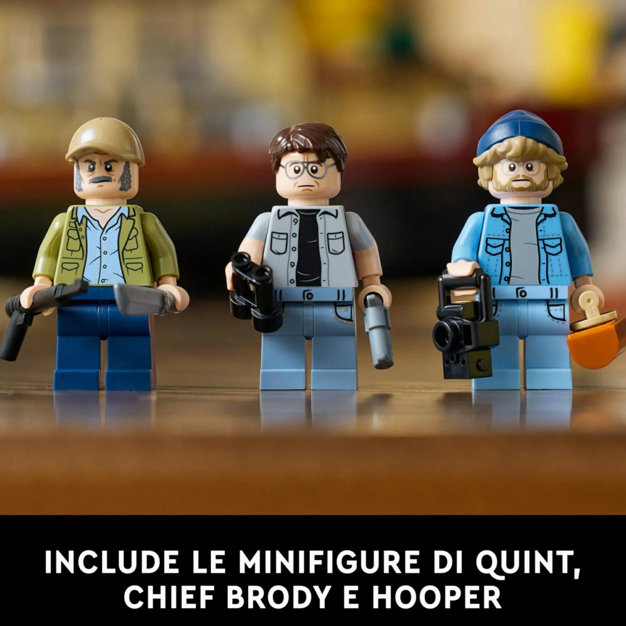 3 minifigure LEGO dei personaggi del film Lo Squalo: Martin Brody, Matt Hooper e Sam Quint, con elementi accessori tra cui un revolver, una bussola, una canna da pesca, un arpione, una lancia e una macchina fotografica